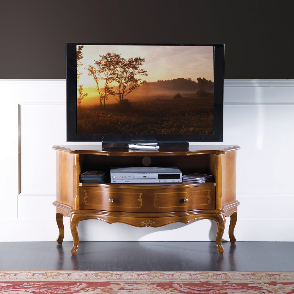 Mueble TV de estilo clásico dotado de un práctico cajón y compartimento, realizado íntegramente en madera con acabado en nogal con incrustaciones, perfecto para amueblar con elegancia cualquier zona de estar.