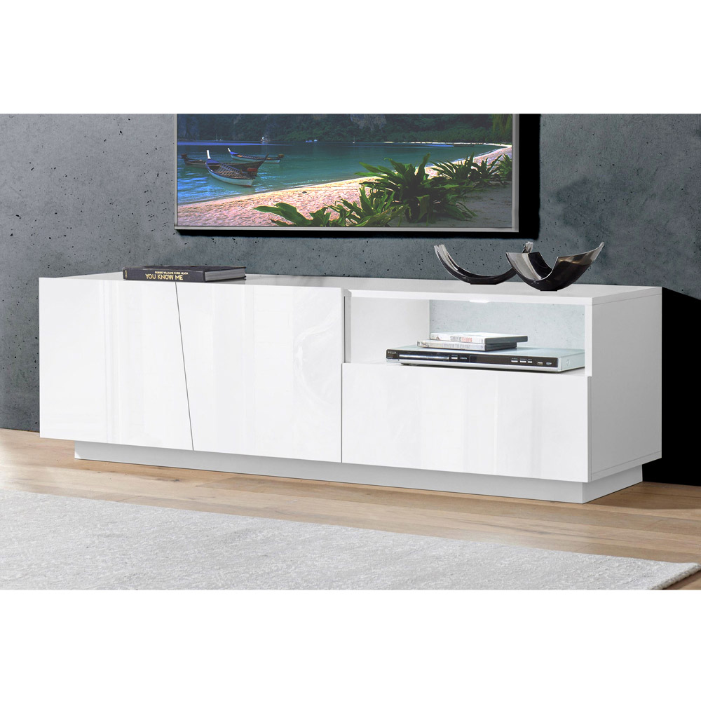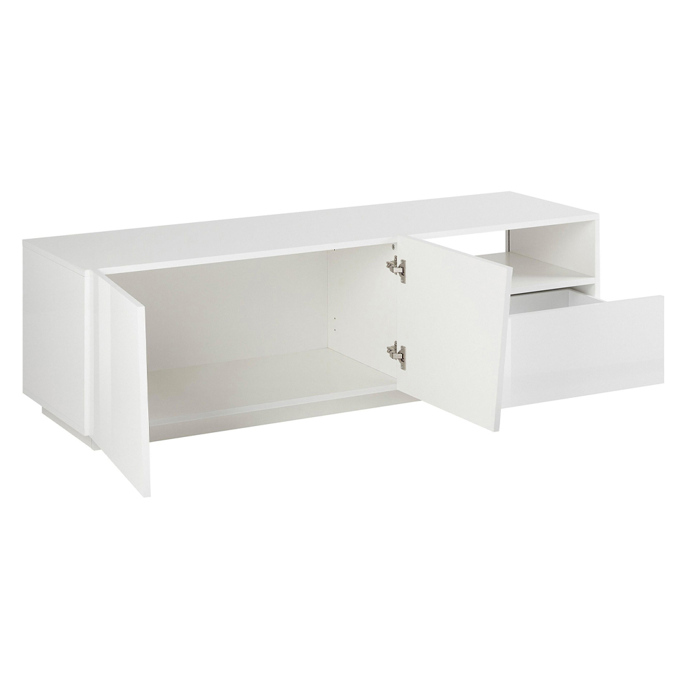 mueble de TV bajo presenta líneas puras y contemporáneas disponibles en dos acabados para caracterizar el salón con gusto y elegancia.