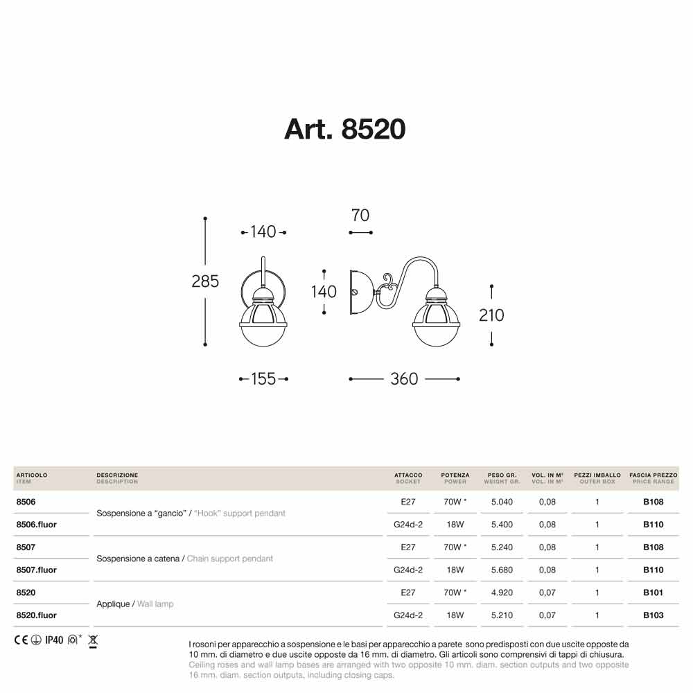 Cimosa está disponible con diferentes enchufes: - aparato con casquillo para bombilla estándar E27 - 70 W - aparato con casquillo para bombilla fluorescente compacta G24d-2- 18 W Bombilla no incluida
