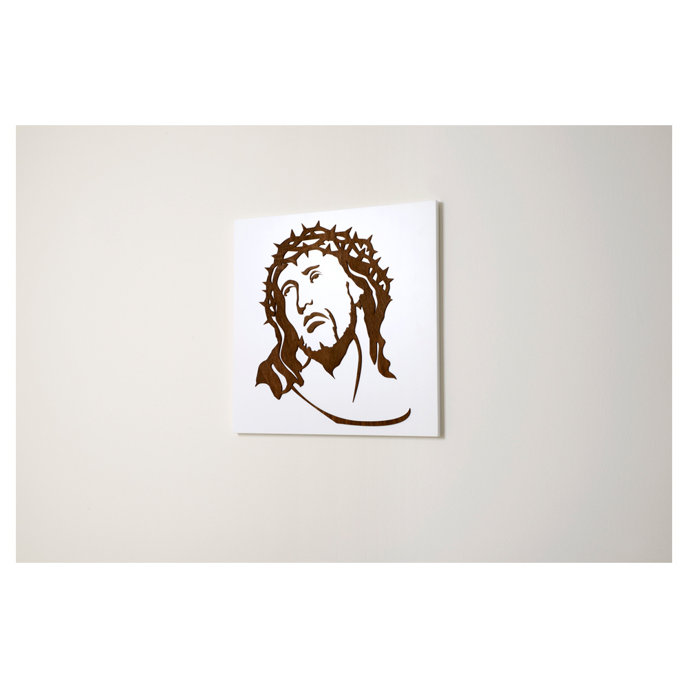 Marco sacro en madera lacada en blanco con aplicación del rostro de Cristo en madera wengé.