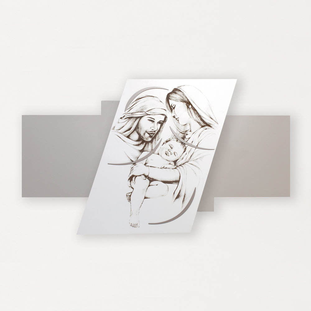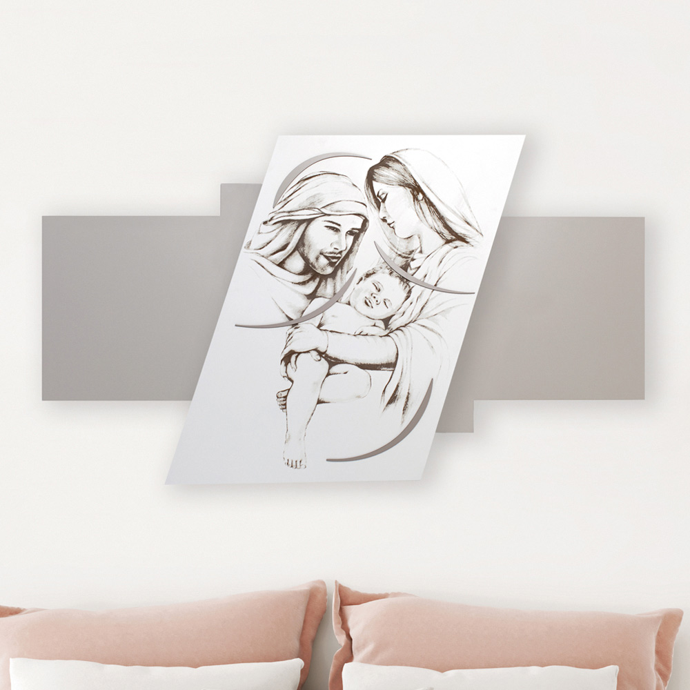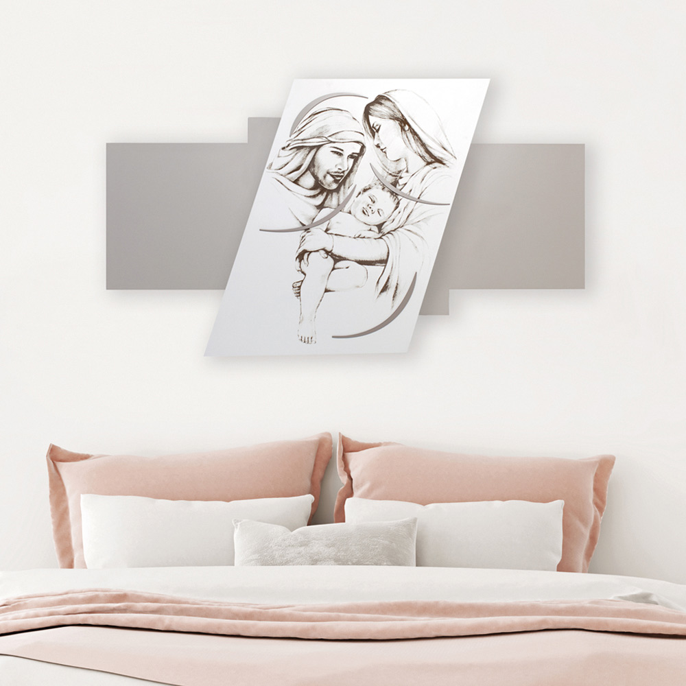 Representa a la Sagrada Familia en marcado láser, es un cabecero con un diseño minimalista perfecto para ambientes modernos. Panel de madera lacado en blanco opaco grabado con láser sobre panel de color guijarro con decoraciones de grava que representan una escena religiosa.