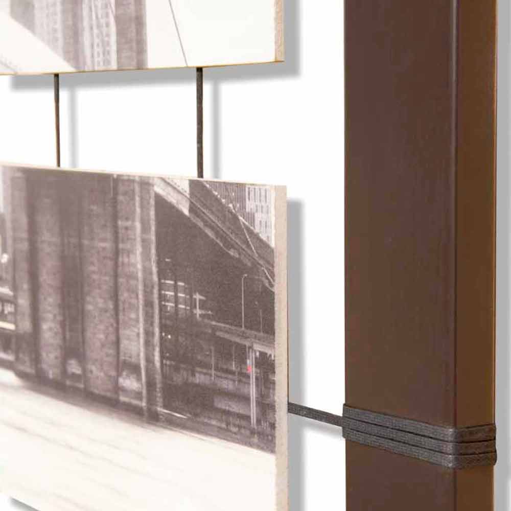 La principal peculiaridad de este marco está encerrado dentro de cada panel. En cada panel, de hecho, se impresionó parte de una misma ciudad, en los tonos blanco y gris, como un rompecabezas dividido en baldosas y suspendido.