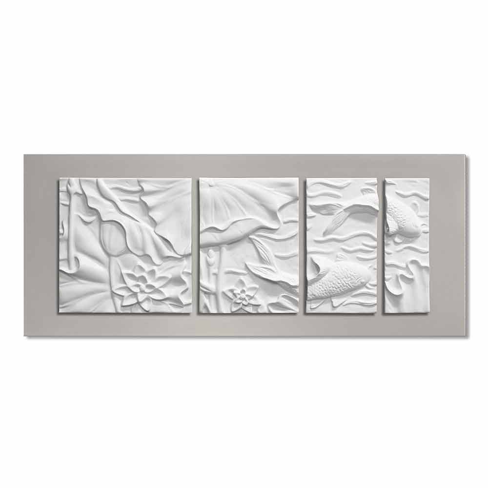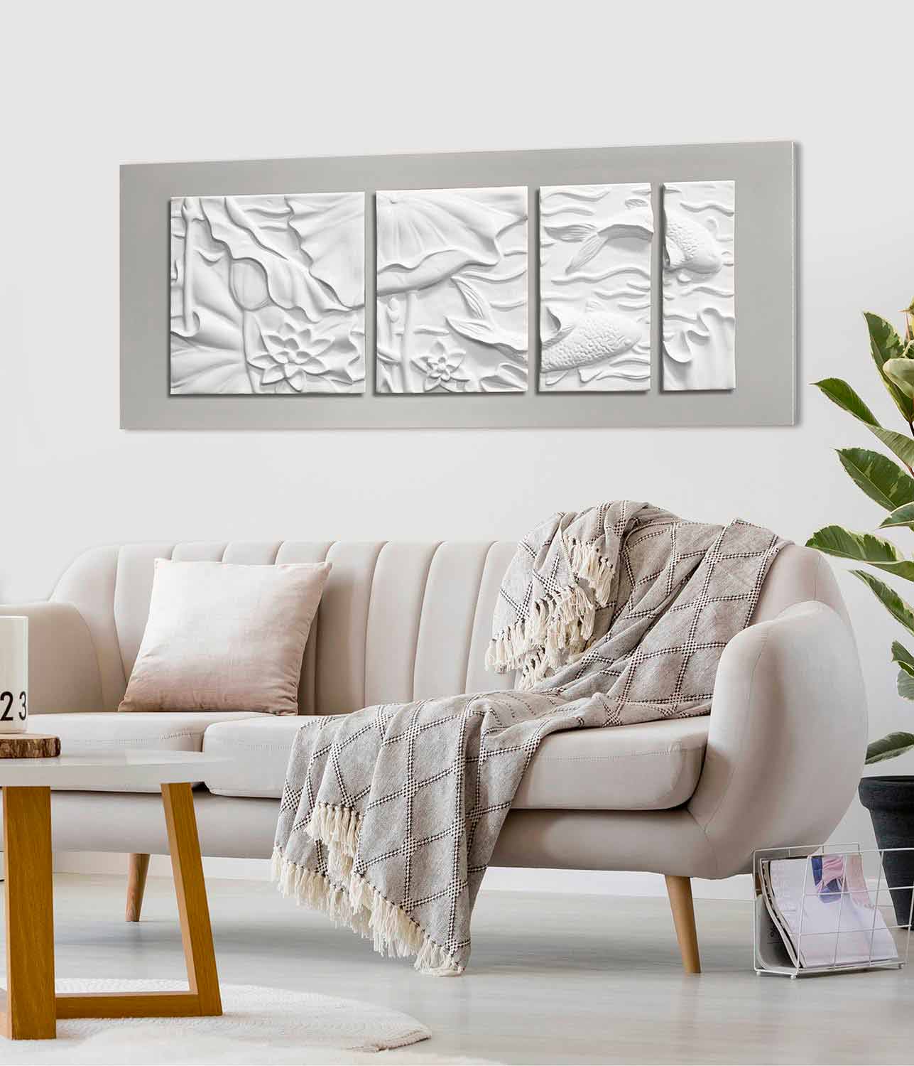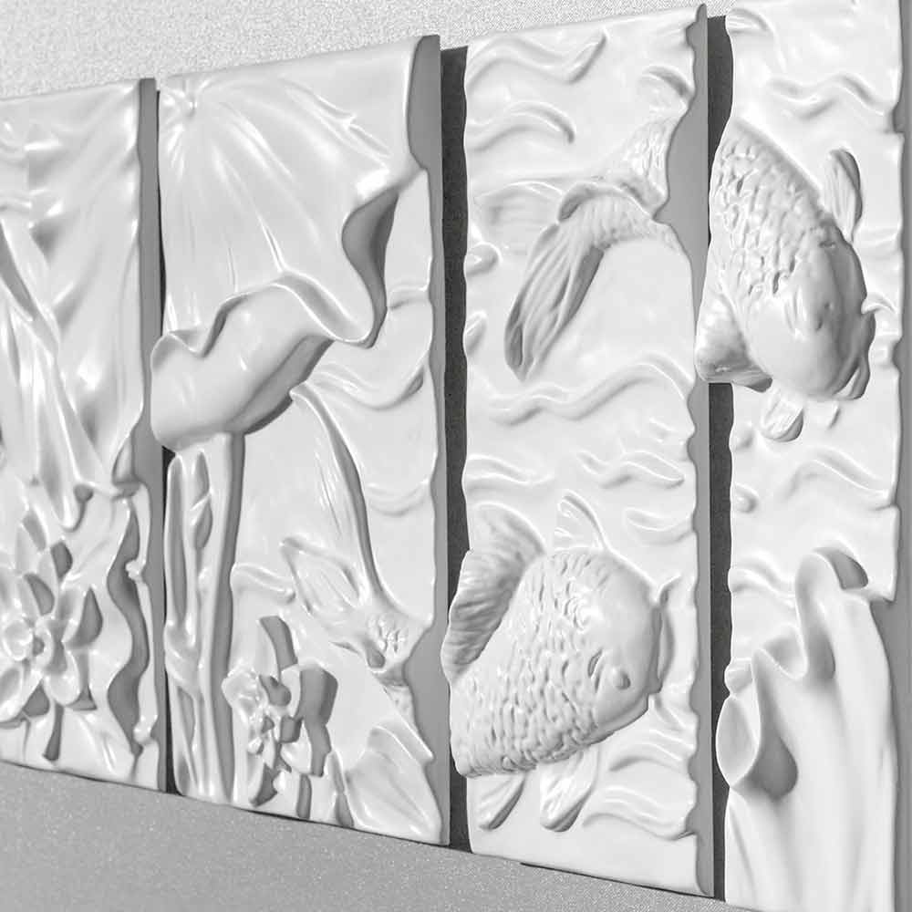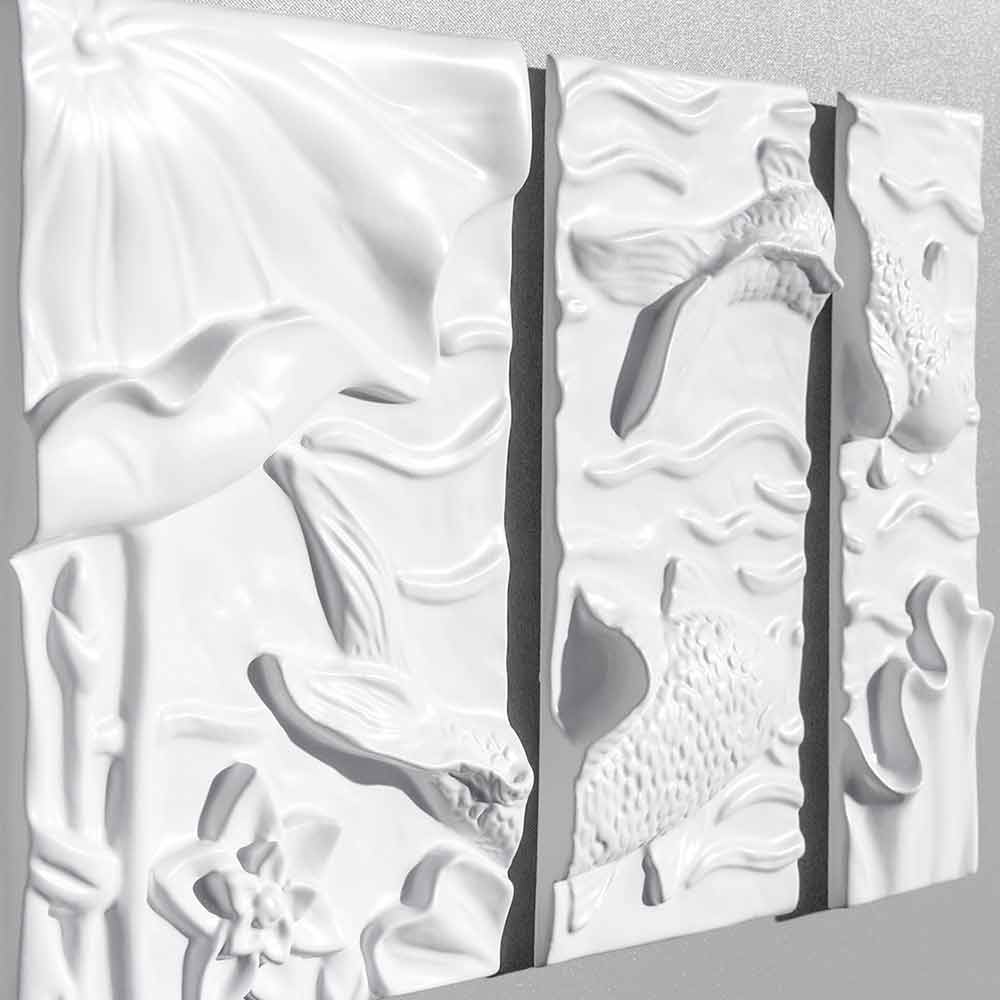 en cerámica compuesta se compone de cuatro elementos con líneas elegantes y formas modernas en blanco marfil que representan la carpa koi japonesa montada sobresaliendo sobre lienzo de seda lacada en gris. El resultado es con un impacto estético minimalista y decorativo, para un estilo único.