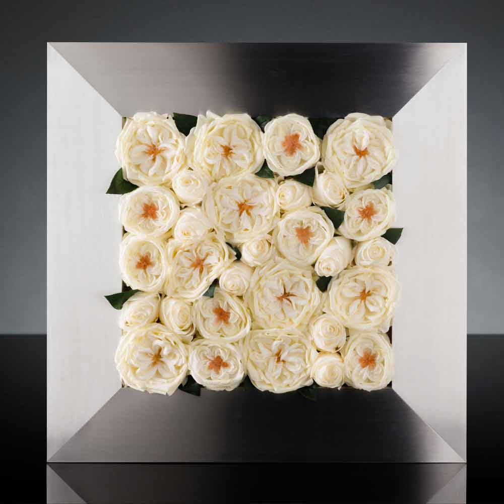Cuadro de pared moderno hecho en Italia en metal cromado y rosas blancas artificiales . Una idea de mobiliario que surge del insólito encuentro entre las bellezas de la naturaleza y un diseño moderno, enfatizando el encanto de ambos mundos de forma exclusiva. Lo que nace es un complemento decorativo con alma sofisticada que sabe amueblar y llenar cualquier ambiente doméstico o contract de un estilo contemporáneo a través de su extrema versatilidad y refinado minimalismo . Ideal para dar sensación de tridimensionalidad a las paredes de tu hogar, este panel juega un papel fundamental al captar todas las miradas gracias a su alma original y creativa que lleva la mente a un paisaje verde dando paz y tranquilidad .