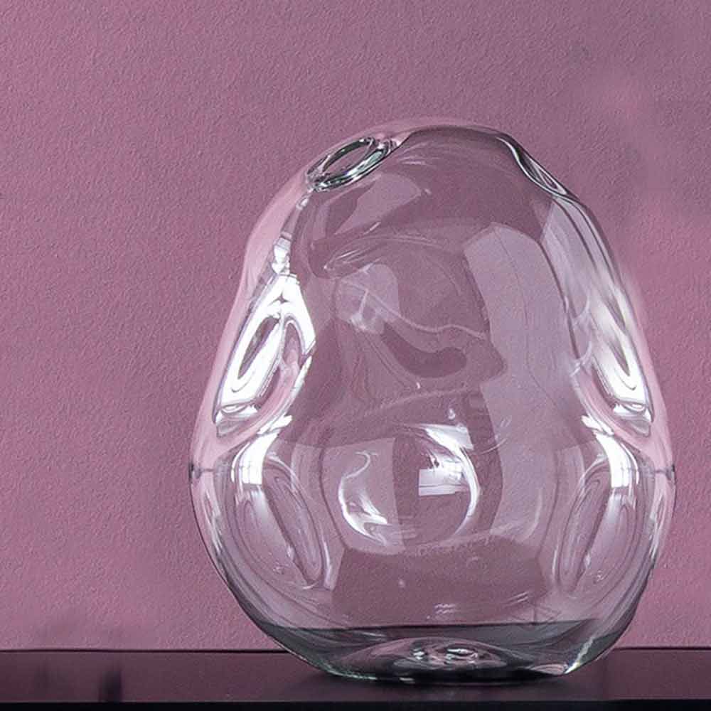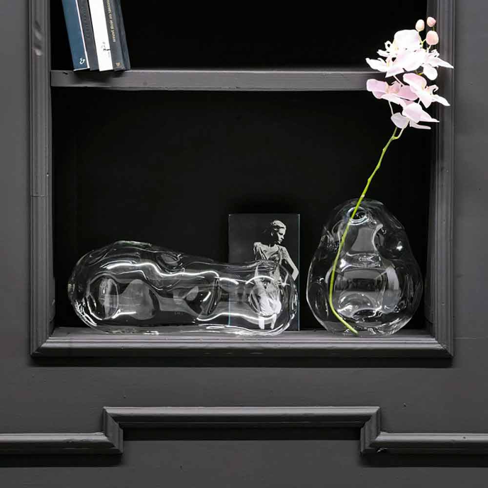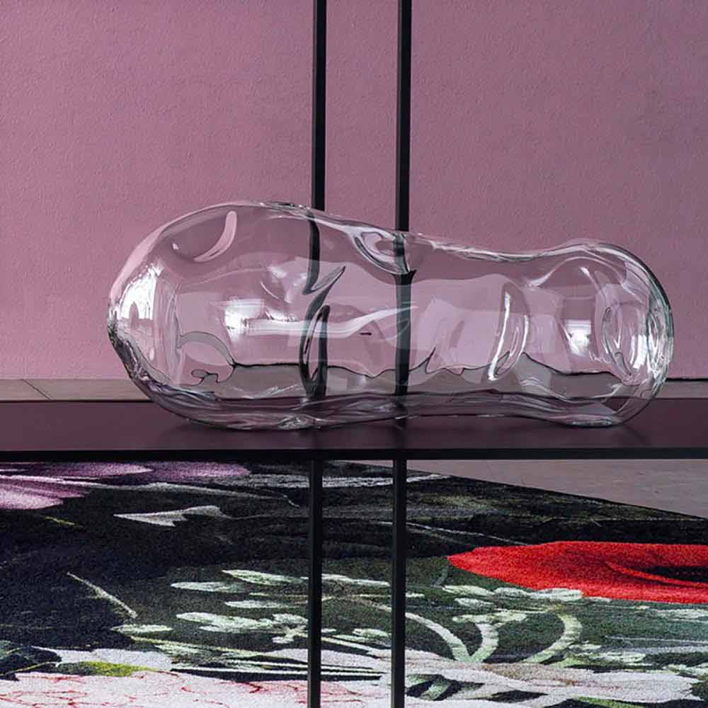 Original par de jarrones decorativos hechos en Italia en vidrio soplado transparente con un diseño excéntrico. Originalidad, creatividad y elegancia son las características peculiares de esta composición de jarrones modernos que se unen para dar vida a una