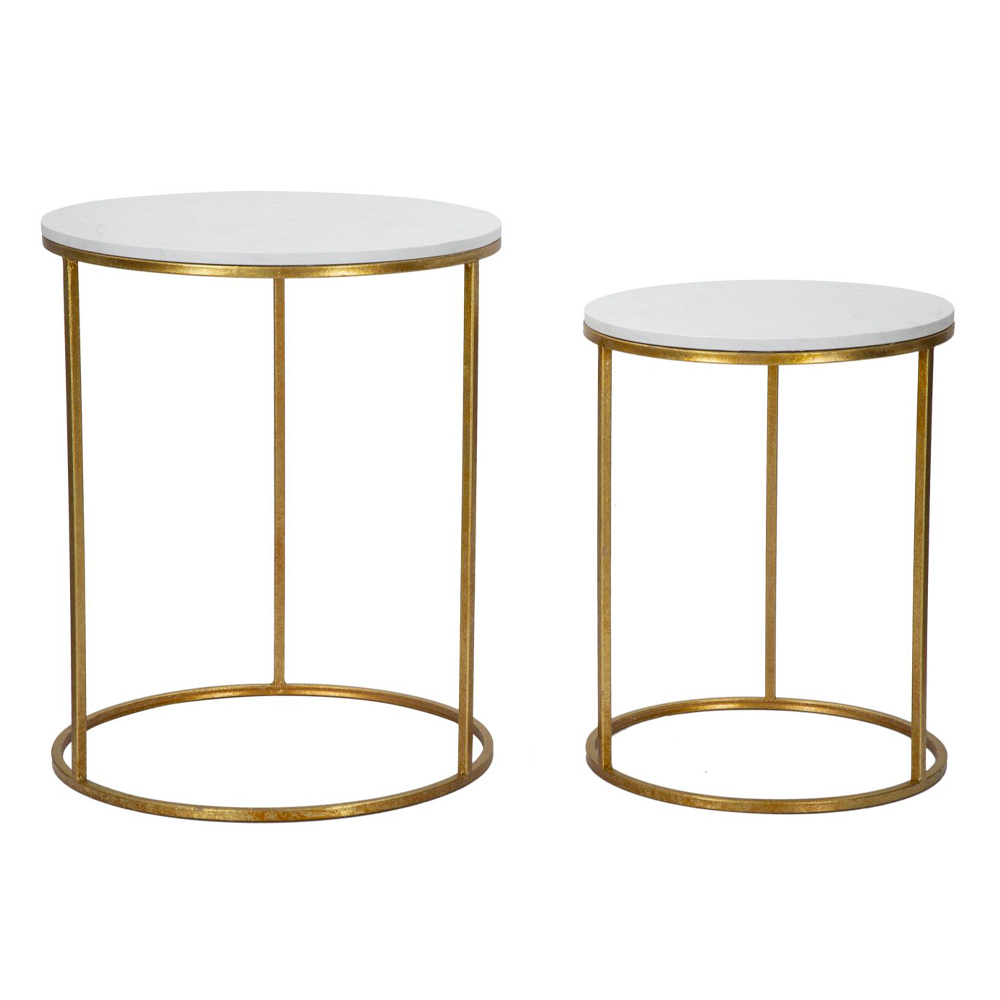 Mesas de centro con estructura de hierro acabado dorado y tapa redonda en