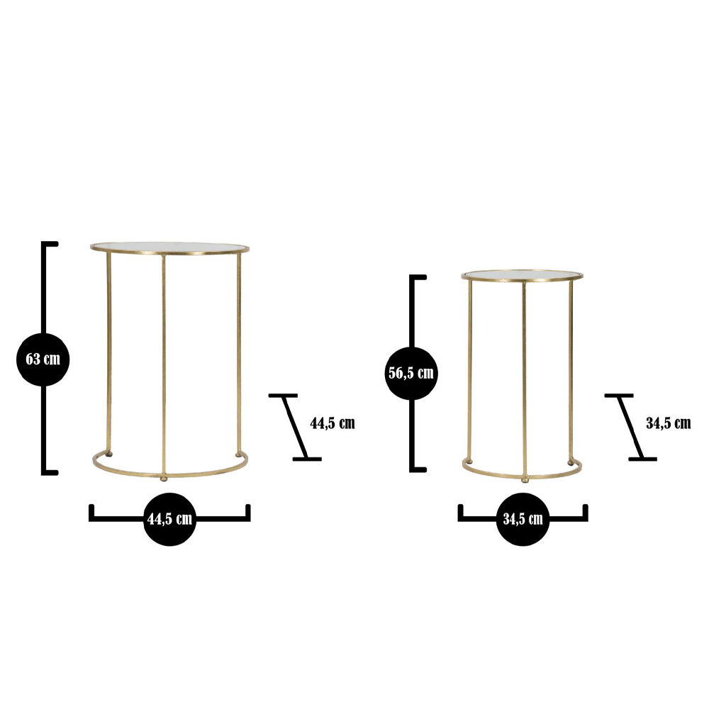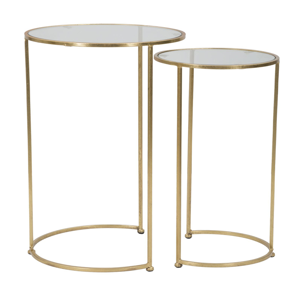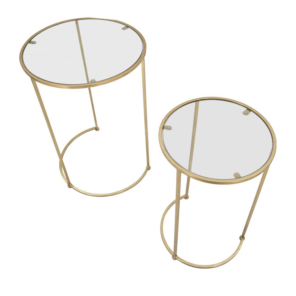 Par de mesas de centro en hierro dorado con tapa redonda de cristal.