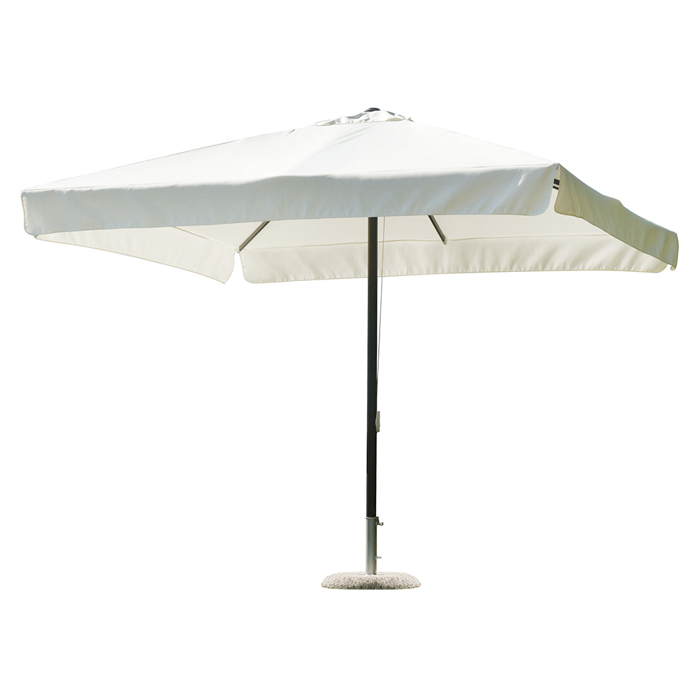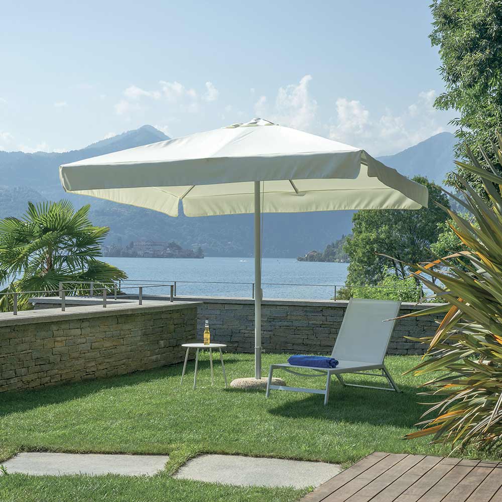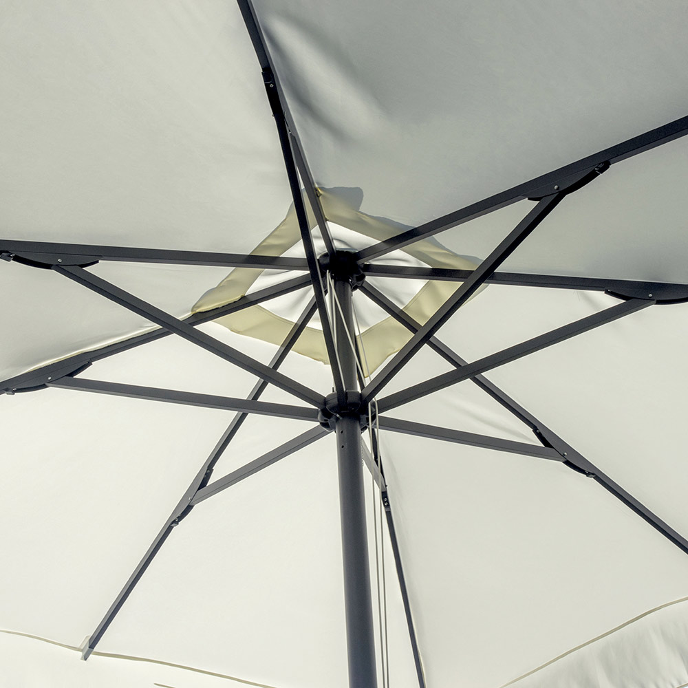 Con una altura máxima de 2,85 metros (con base) , esta sombrilla se adapta perfectamente a jardines, terrazas, zonas exteriores de clubes o espacios contract, ofreciendo una zona de sombra elegante y acogedora.