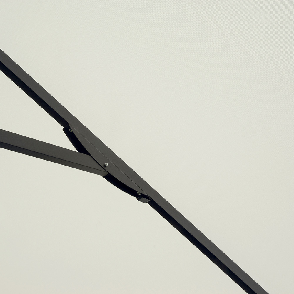 Esta sombrilla de 3 x 3 metros es la solución ideal para quienes buscan combinar estilo, funcionalidad y comodidad en sus espacios exteriores. Su estructura de aluminio, con un mástil central de 58 mm de diámetro y ocho robustas varillas de 18 x 28 mm, garantiza estabilidad y durabilidad, a la vez que mantiene una estética elegante y contemporánea.