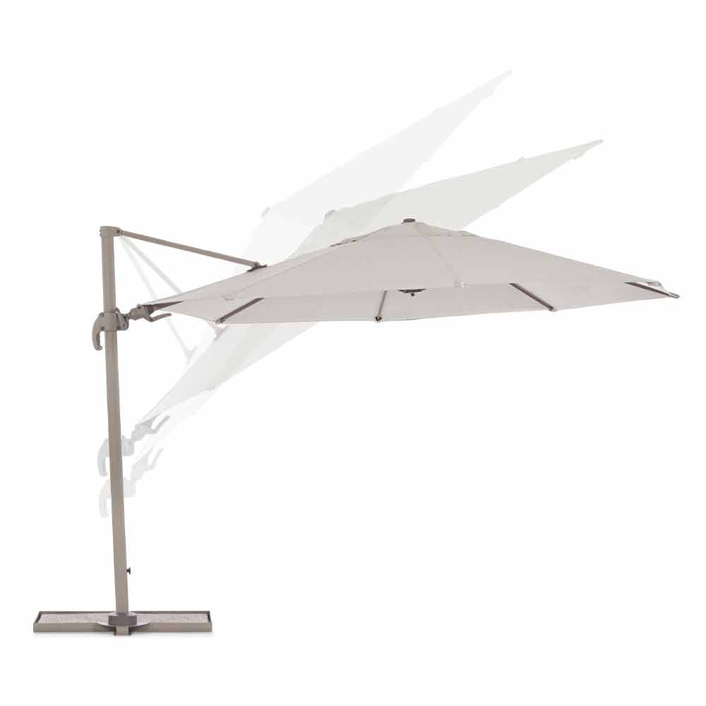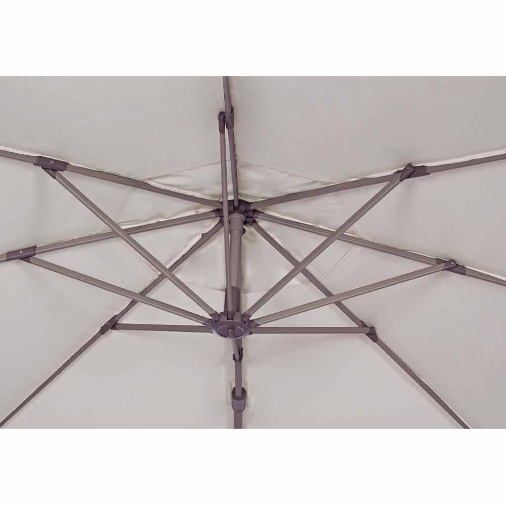 Estructura de aluminio pintado en polvo (poliéster). Poste 50x78x1.6mm. 8 varillas 12x23x1.0mm. Tejido de poliéster color arena 200gr / m2 con revestimiento de pa (poliamida). Base lateral en acero . Poste giratorio de 360 ° con pedal. Inclinación vertical con asa de 5 posiciones. Equipado con asa para inclinar el paraguas de derecha a izquierda.