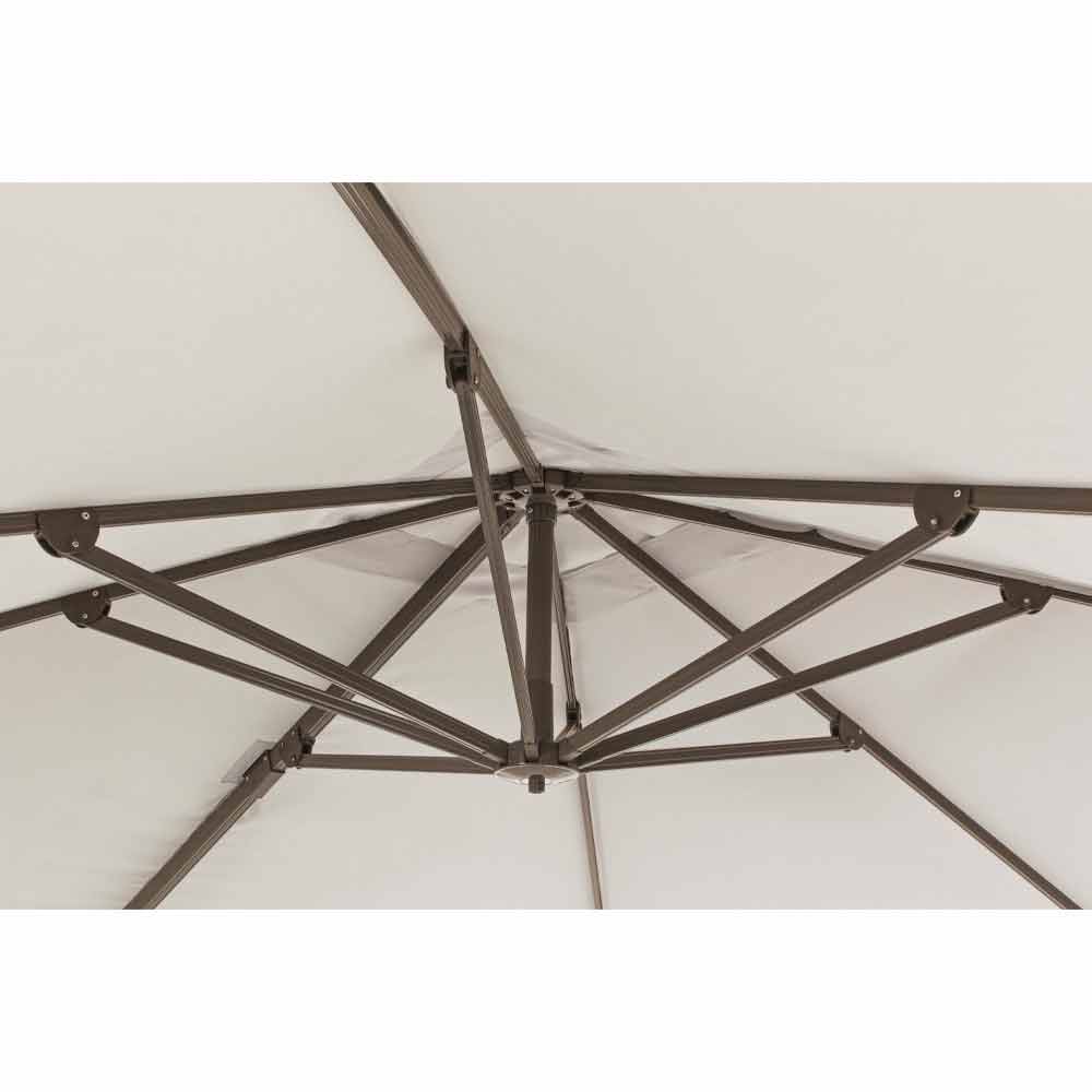 Estructura de aluminio pintado en polvo (poliéster). Poste de 53x77mm, poste suspendido de 25x40mm, 8 varillas de 14x24mm. Tejido poliéster natural 200gr / m2 con revestimiento de pa (poliamida). Base cruzada en acero . Poste giratorio manual de 360 °.