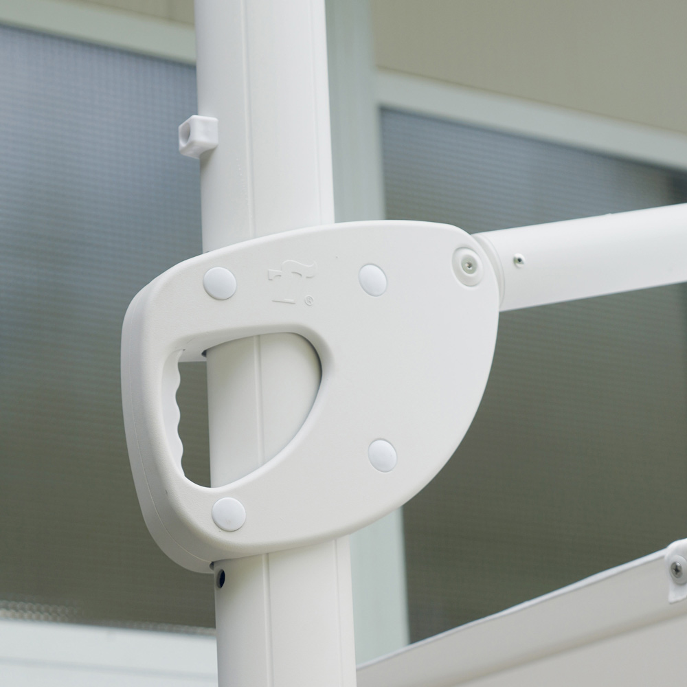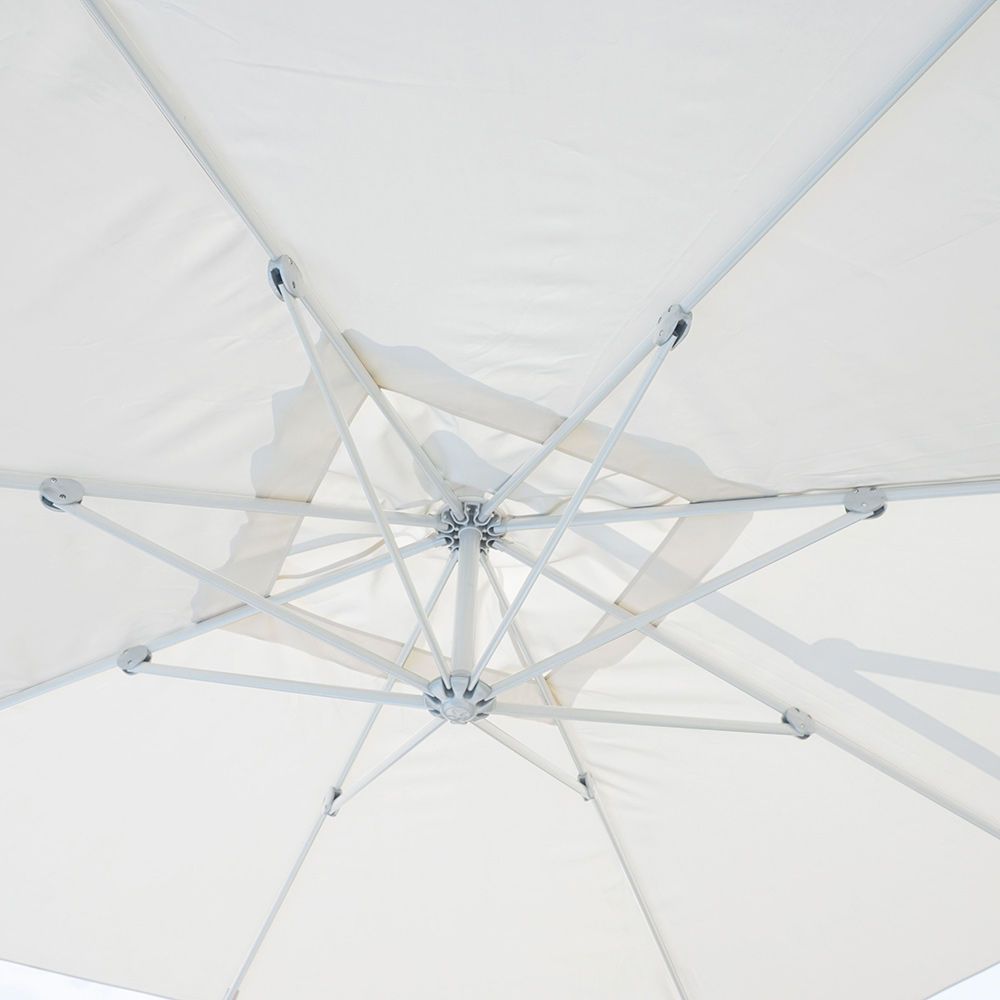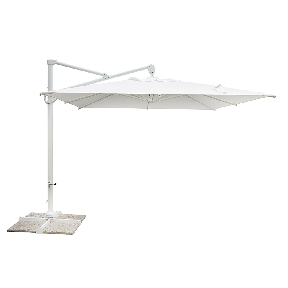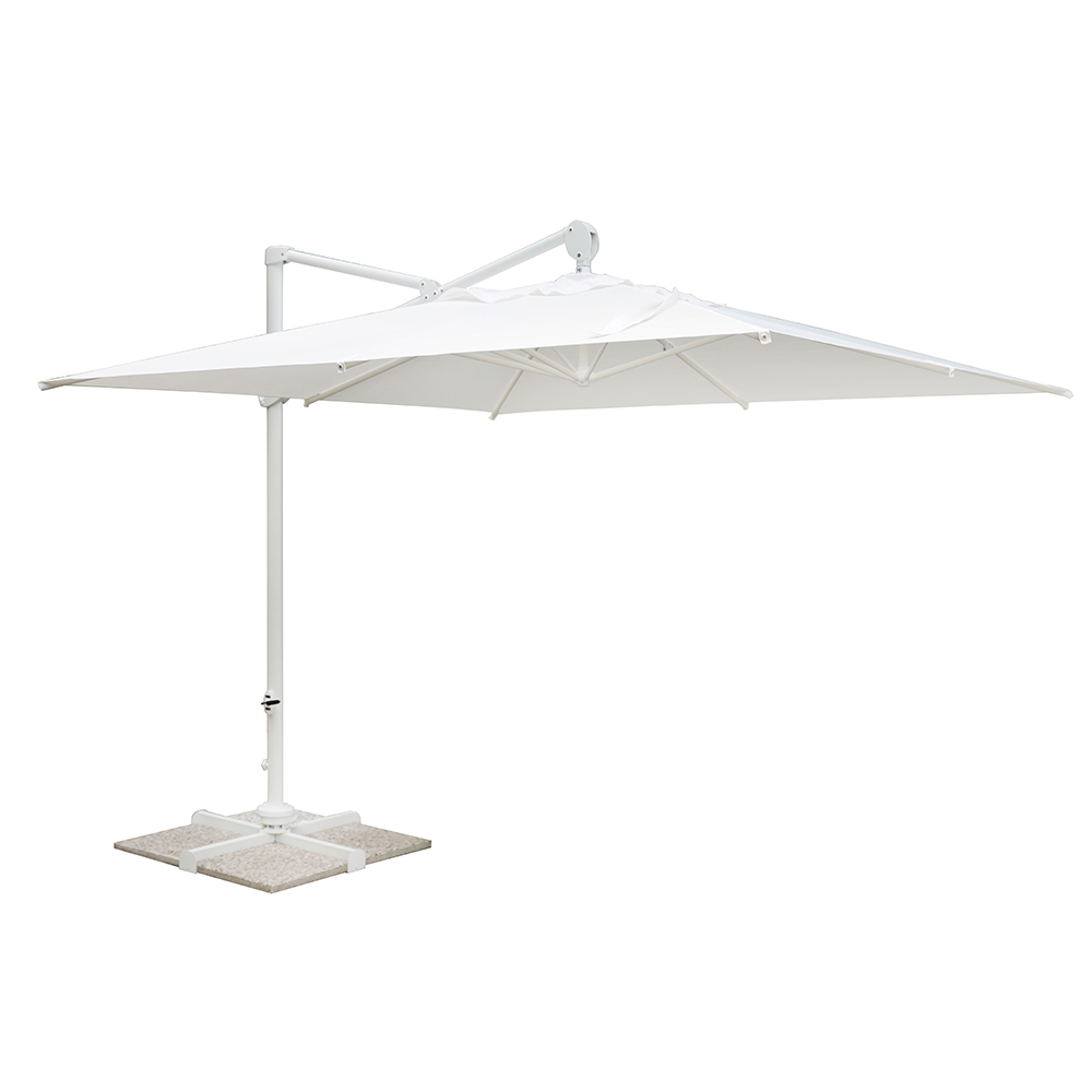 Paraguas de exterior cuadrado con estructura de aluminio en color blanco.