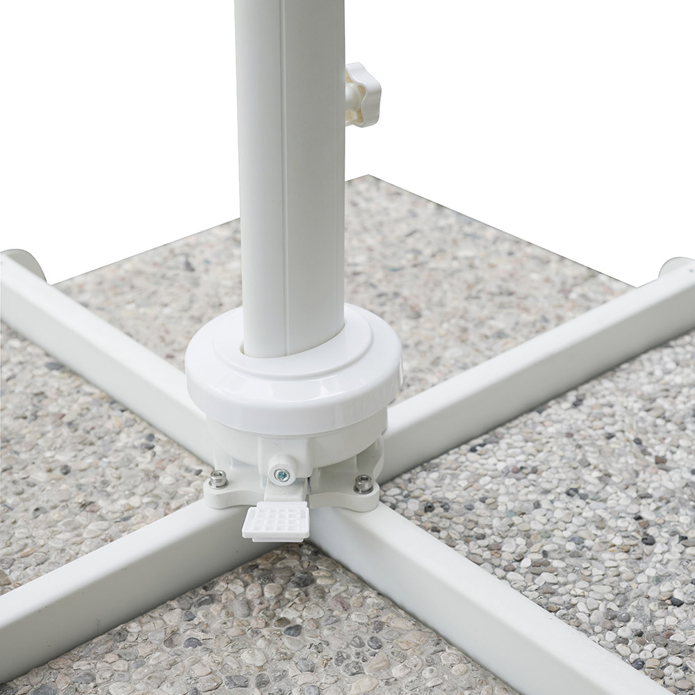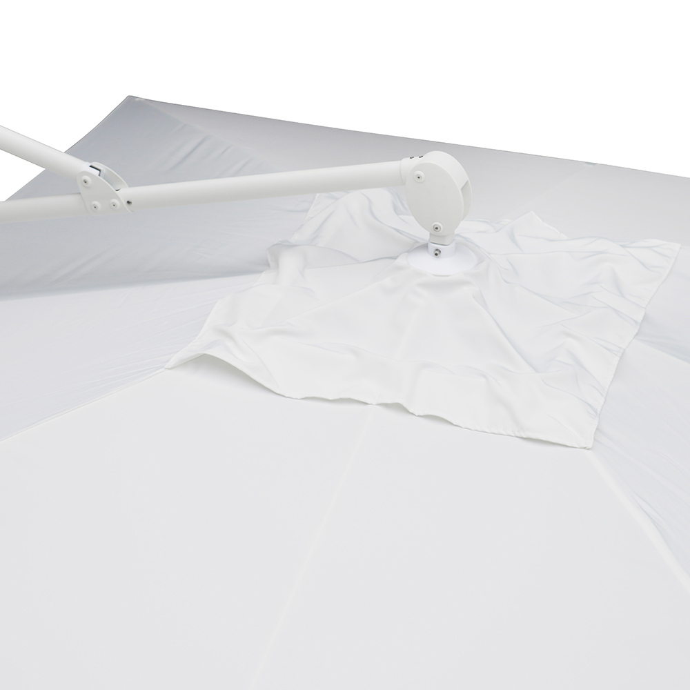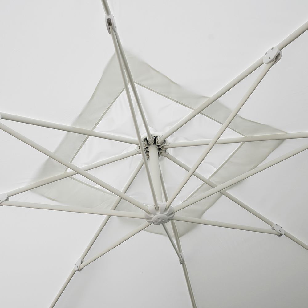 Sombrilla de jardín con tejido de poliéster blanco de 300 gr con alta protección UV , orientable hasta 360° con cortavientos completo con 8 varillas (16x28 mm) y estructura de aluminio con base en cruz a máxima altura con base de 2,80 metros completo con asa y funda.