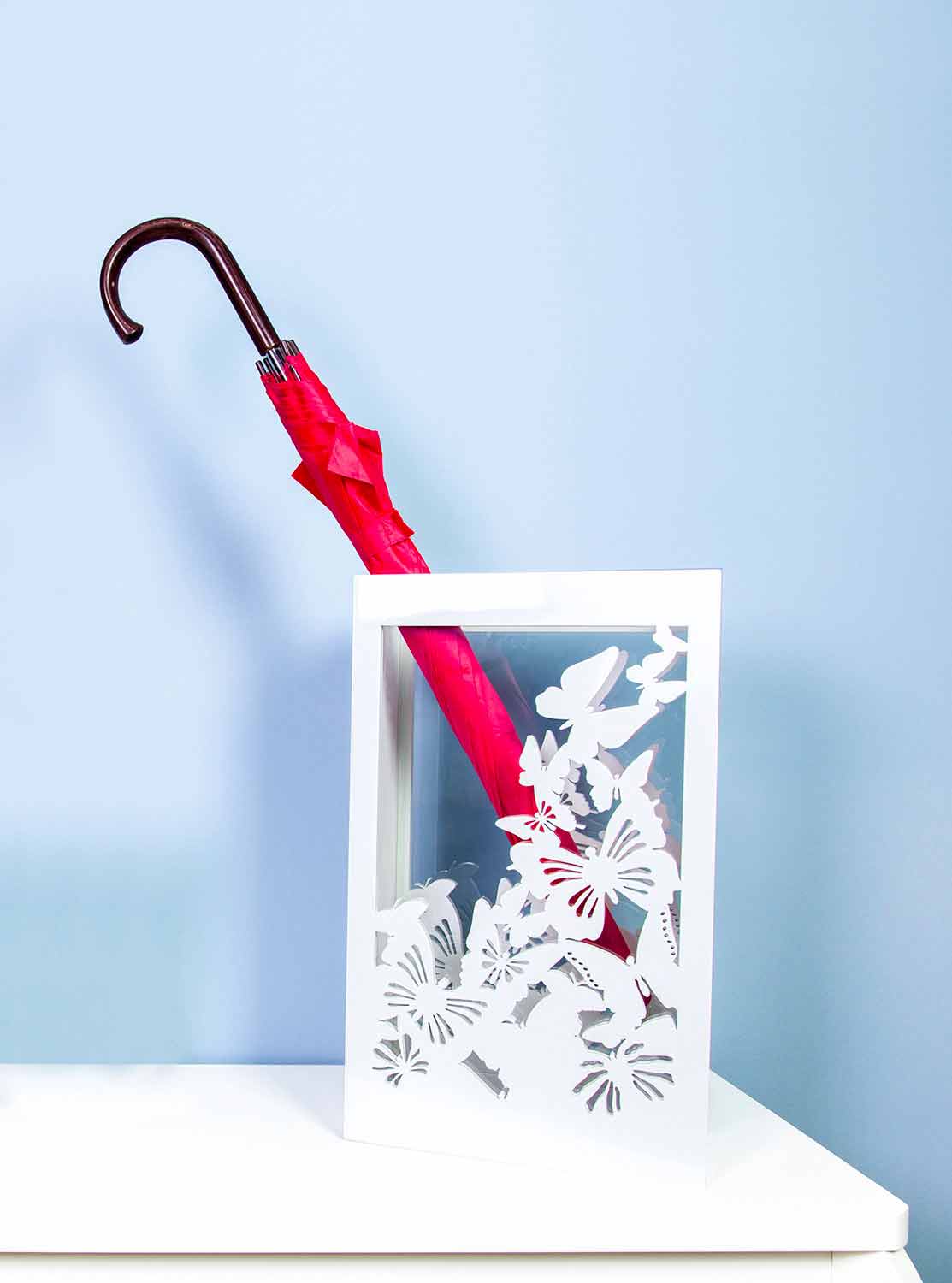 Paragüero de pie en madera blanca, grava, gris paloma o arena con un diseño moderno decorado con mariposas, hecho en Italia.