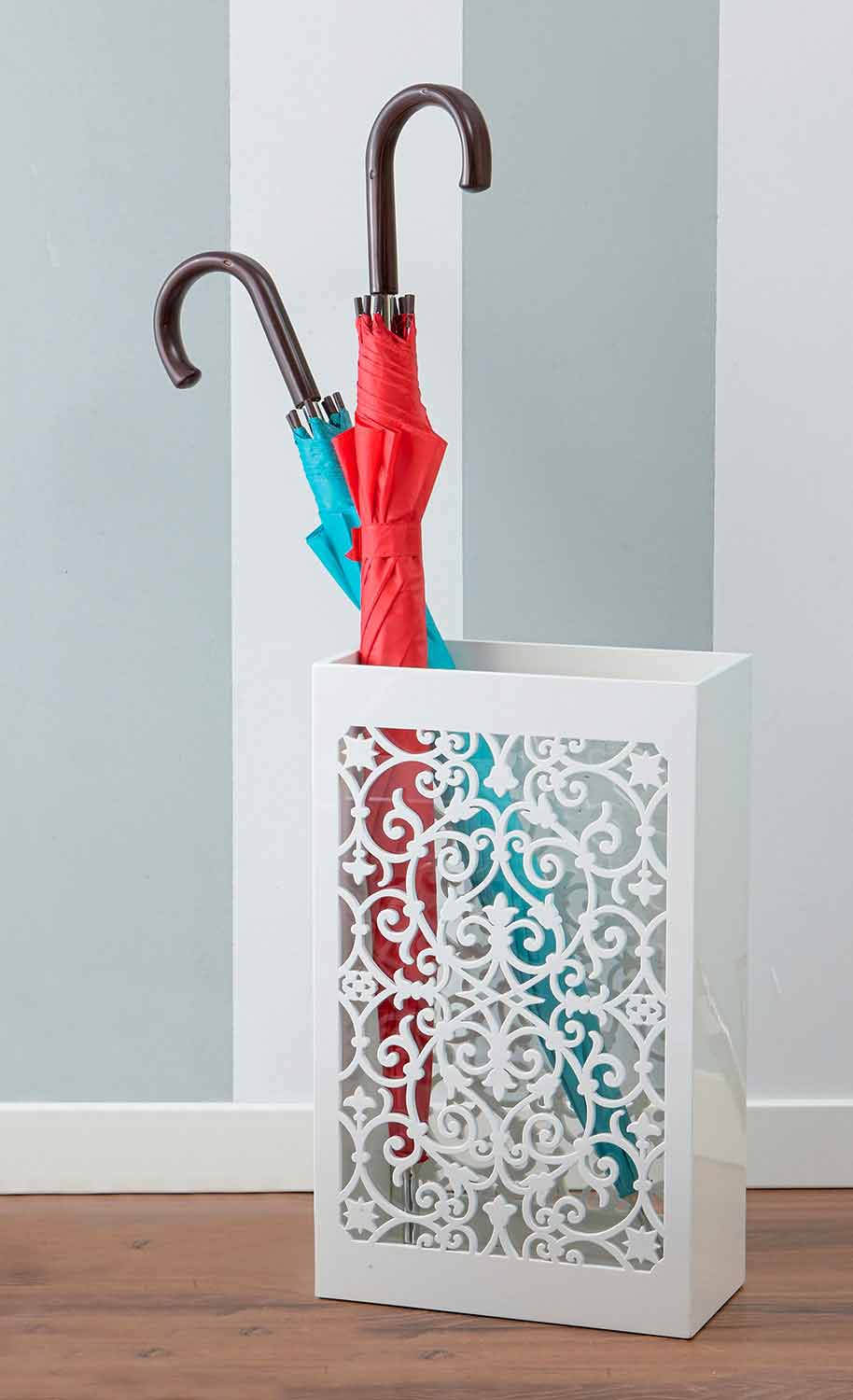 Paragüero de pie en madera blanca, grava, gris paloma o arena con un diseño moderno decorado con mariposas, hecho en Italia.