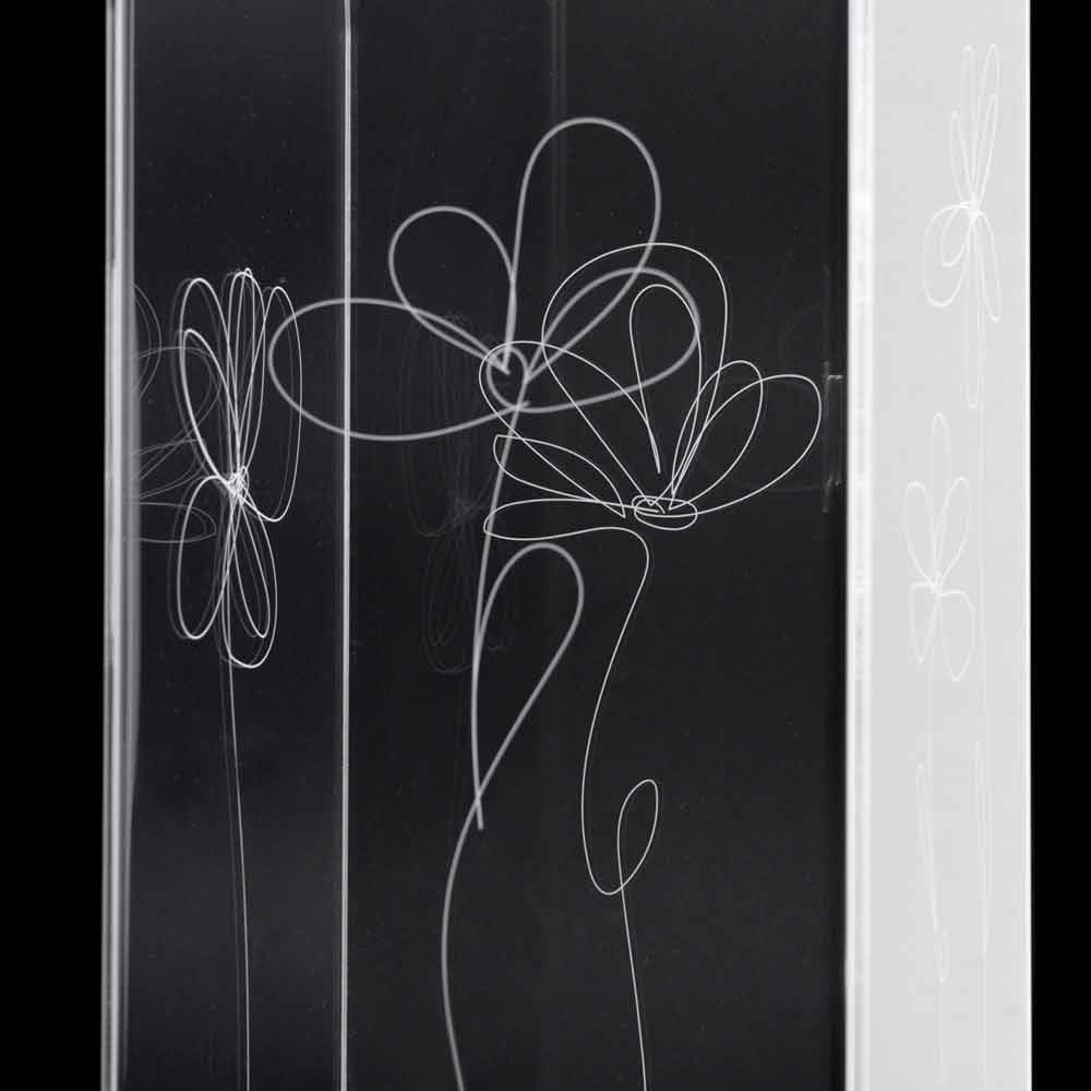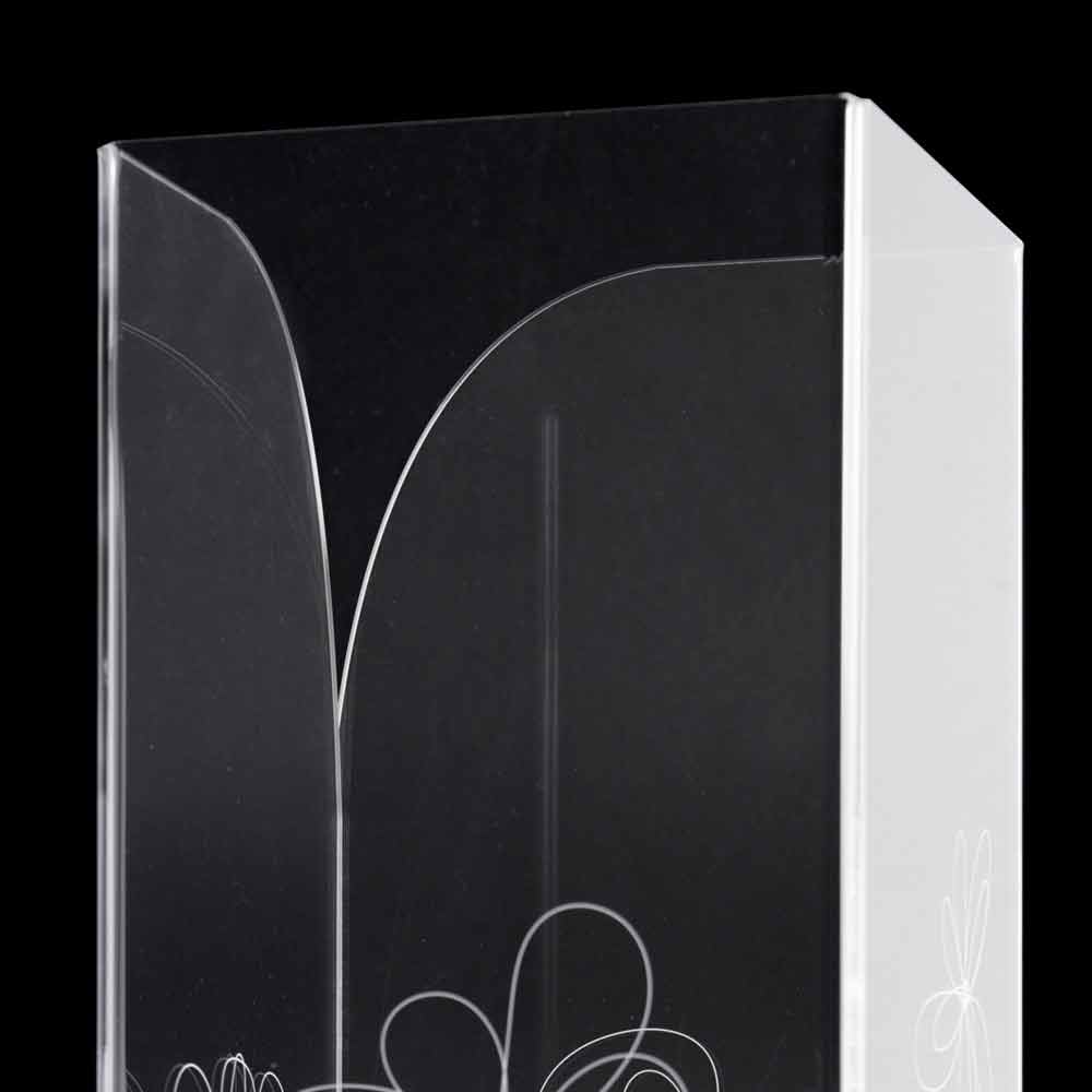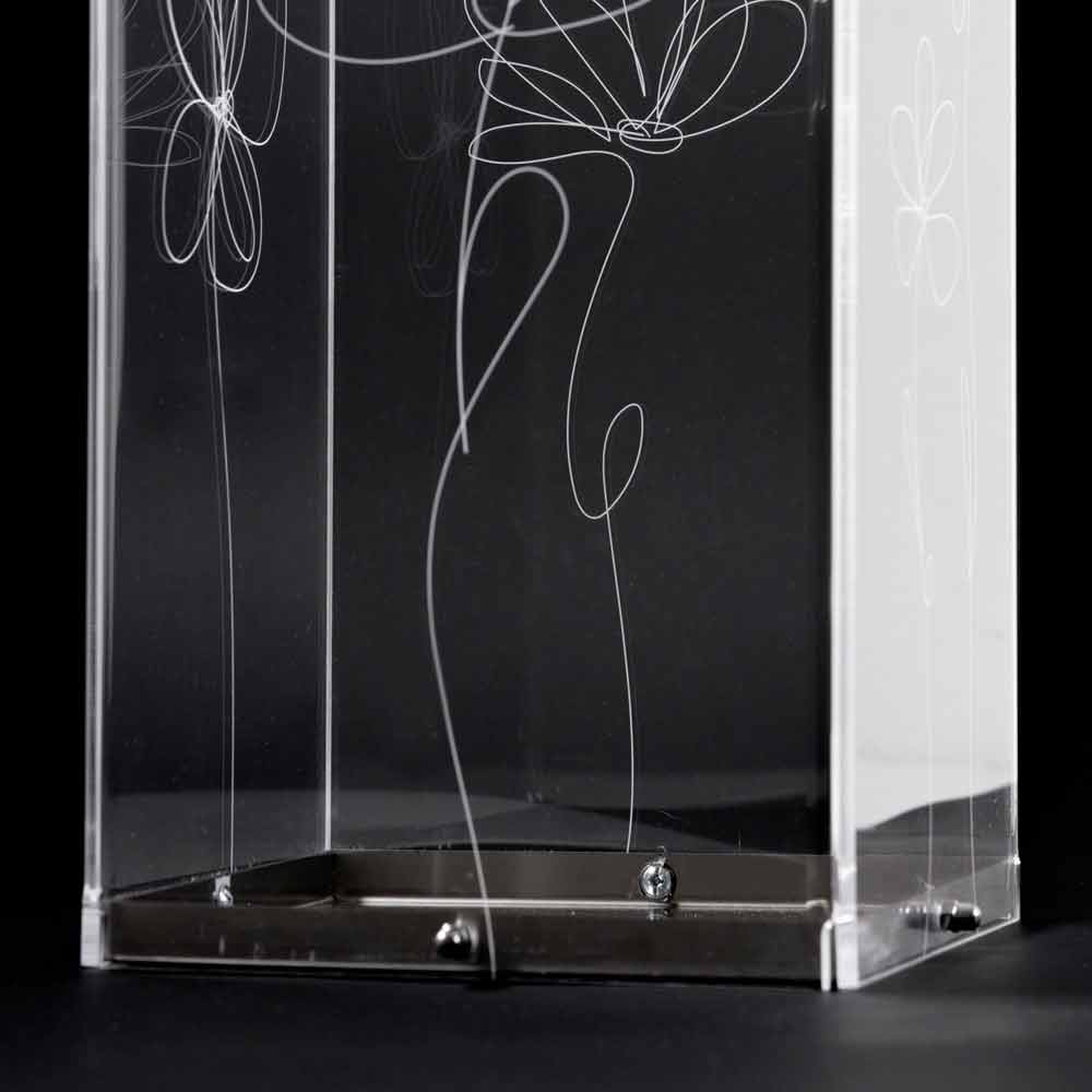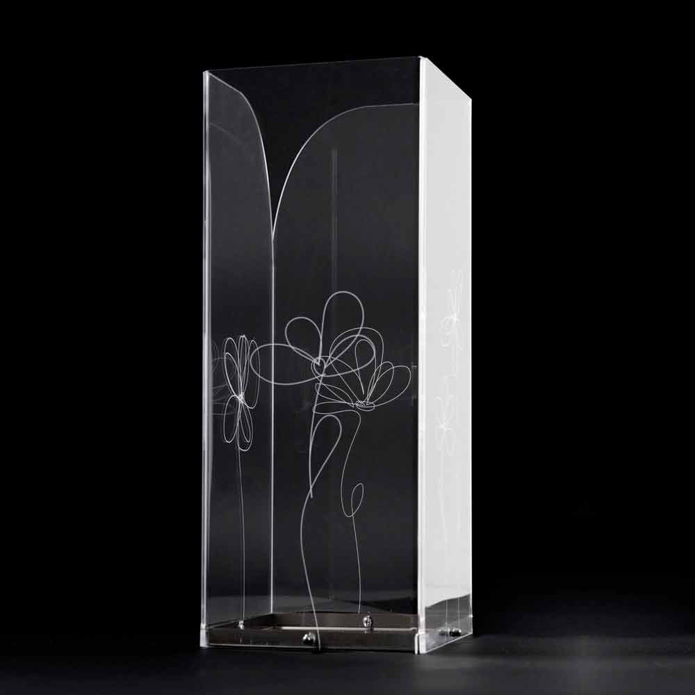 Paragüero en plexiglás transparente que se caracteriza por decoraciones florales marcadas con láser con un estilo estilizado con base de acero inoxidable.