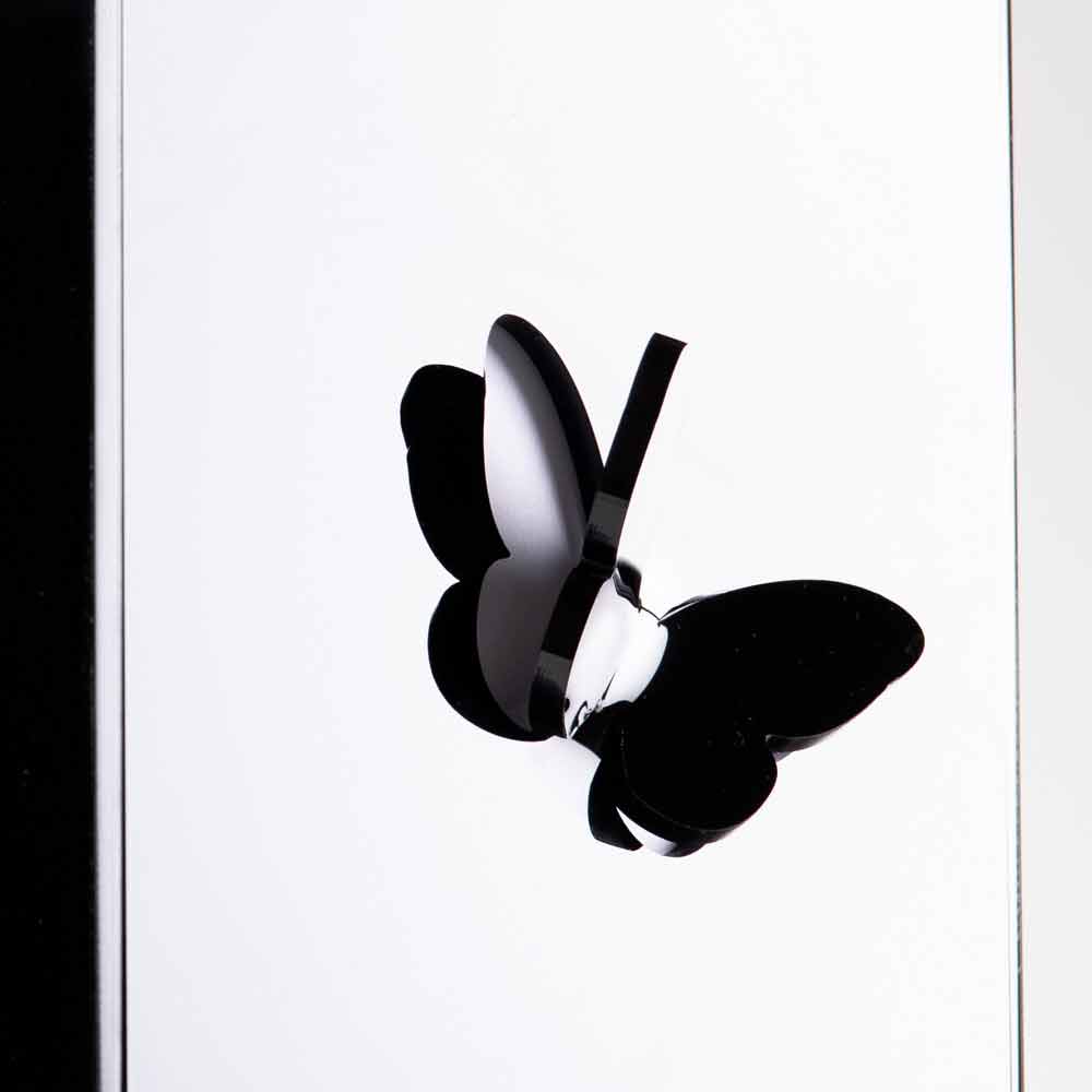 El paragüero en plexiglás negro se caracteriza por la representación de ramas de invierno marcadas con láser y mariposas decoradas en tres dimensiones y base de acero inoxidable.