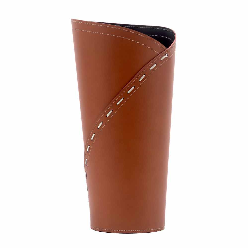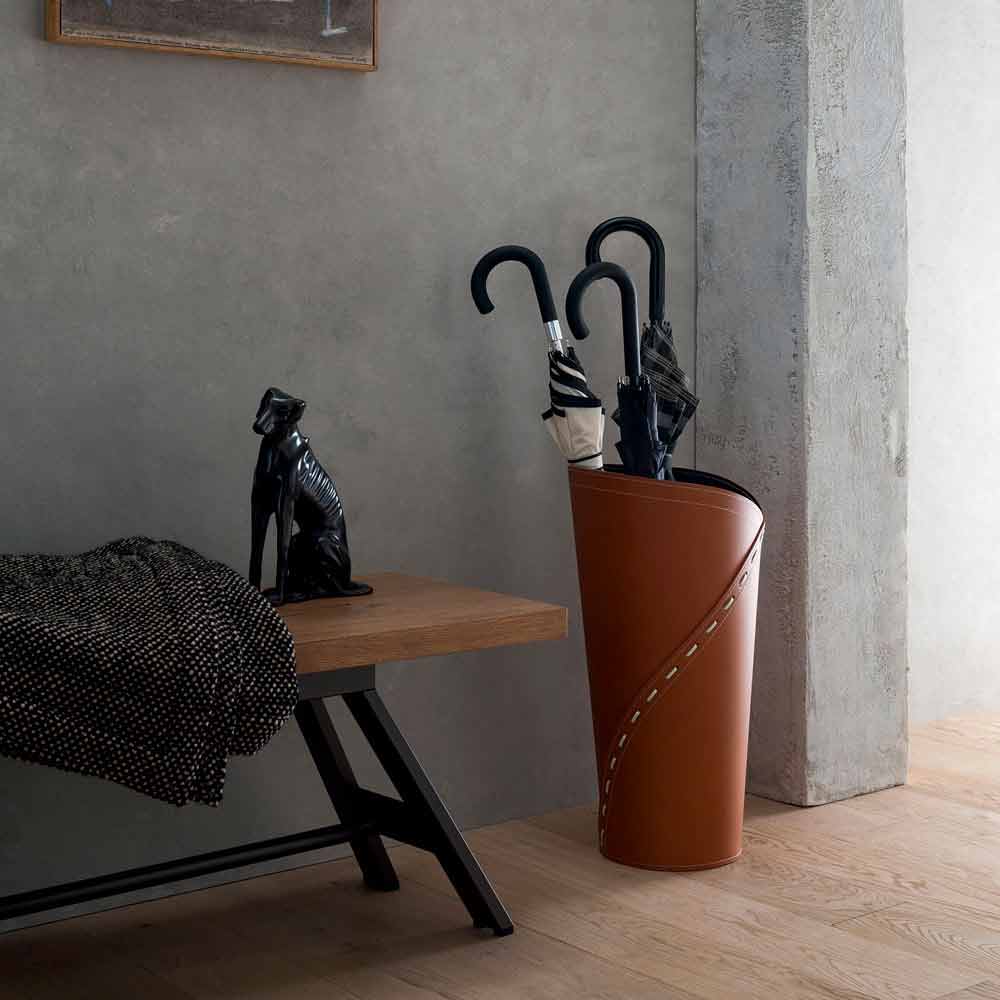 El paragüero Katrina está hecho de cuero regenerado, que cubre las superficies internas y externas. La costura visible es un detalle elegante que contribuye a conferir un valor decorativo a un complemento puramente funcional.