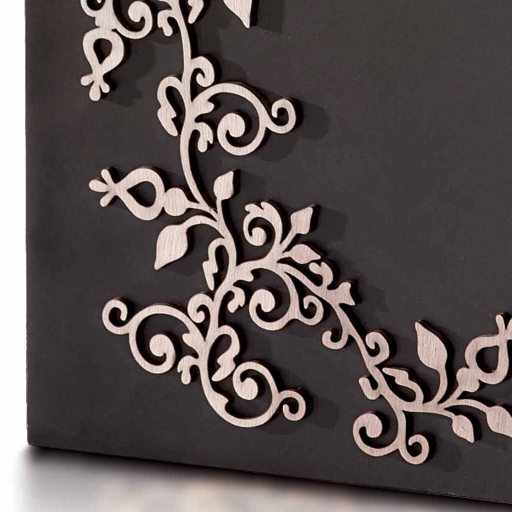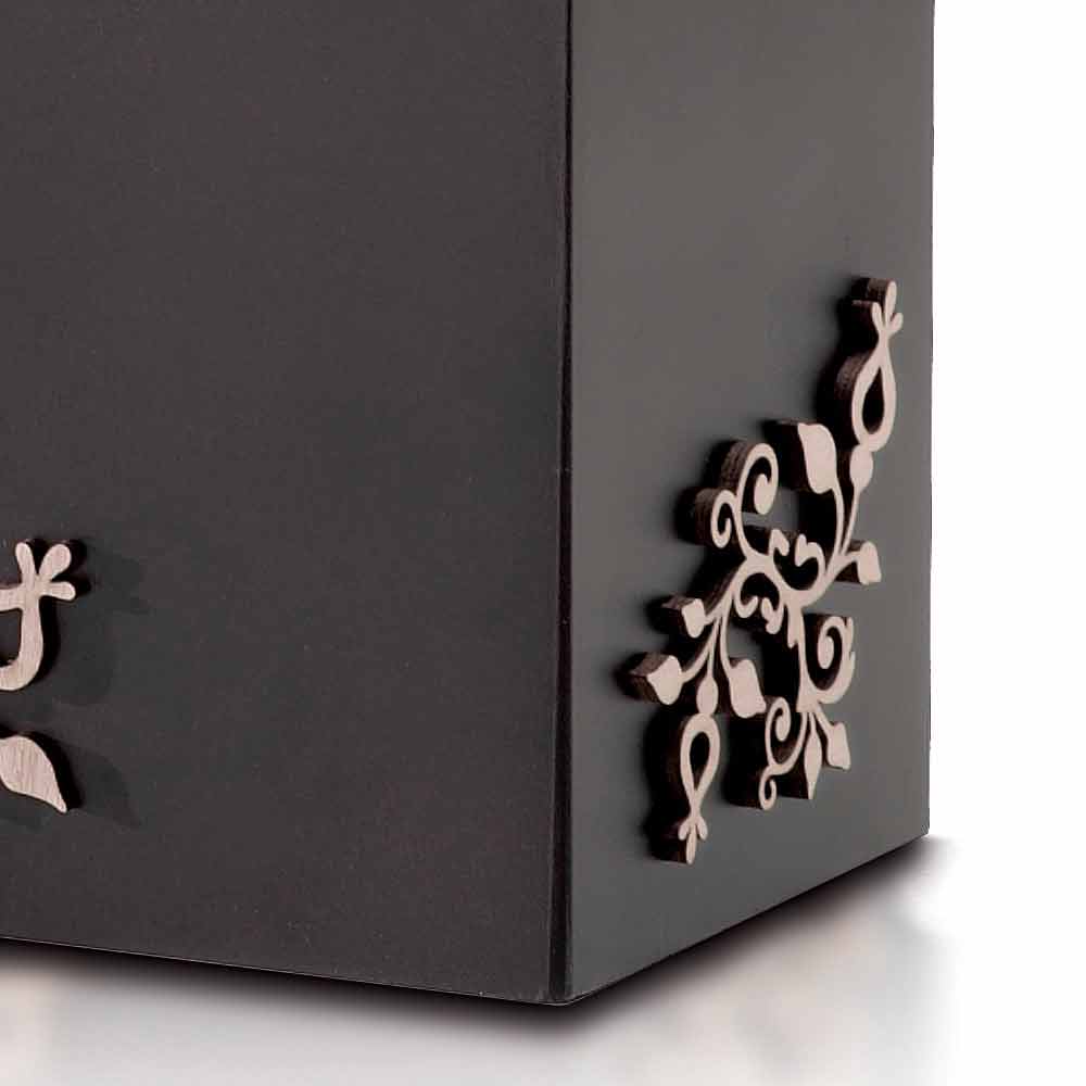Dimensiones: Material: - Madera lacada en forma de corte láser con aplicación decorativa de madera