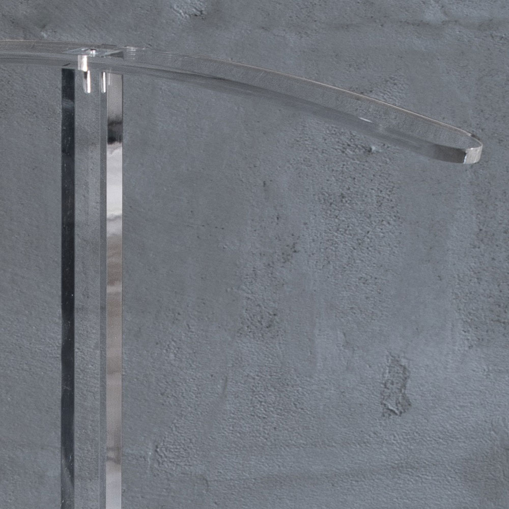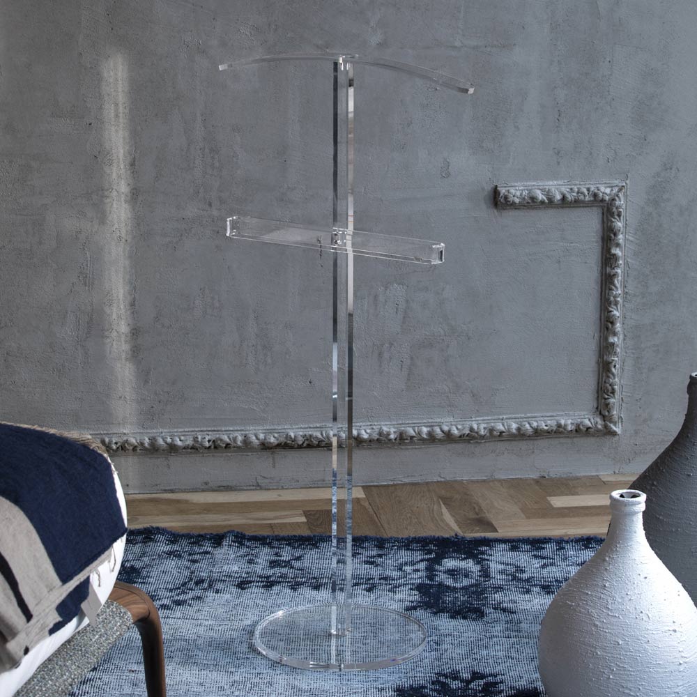 Hecha completamente de cristal acrílico transparente con un perchero de 8 mm de grosor y una barra de pantalón cuadrada de 25 mm de grosor, tiene una base redonda de 30 cm de diámetro y 15 mm de grosor.