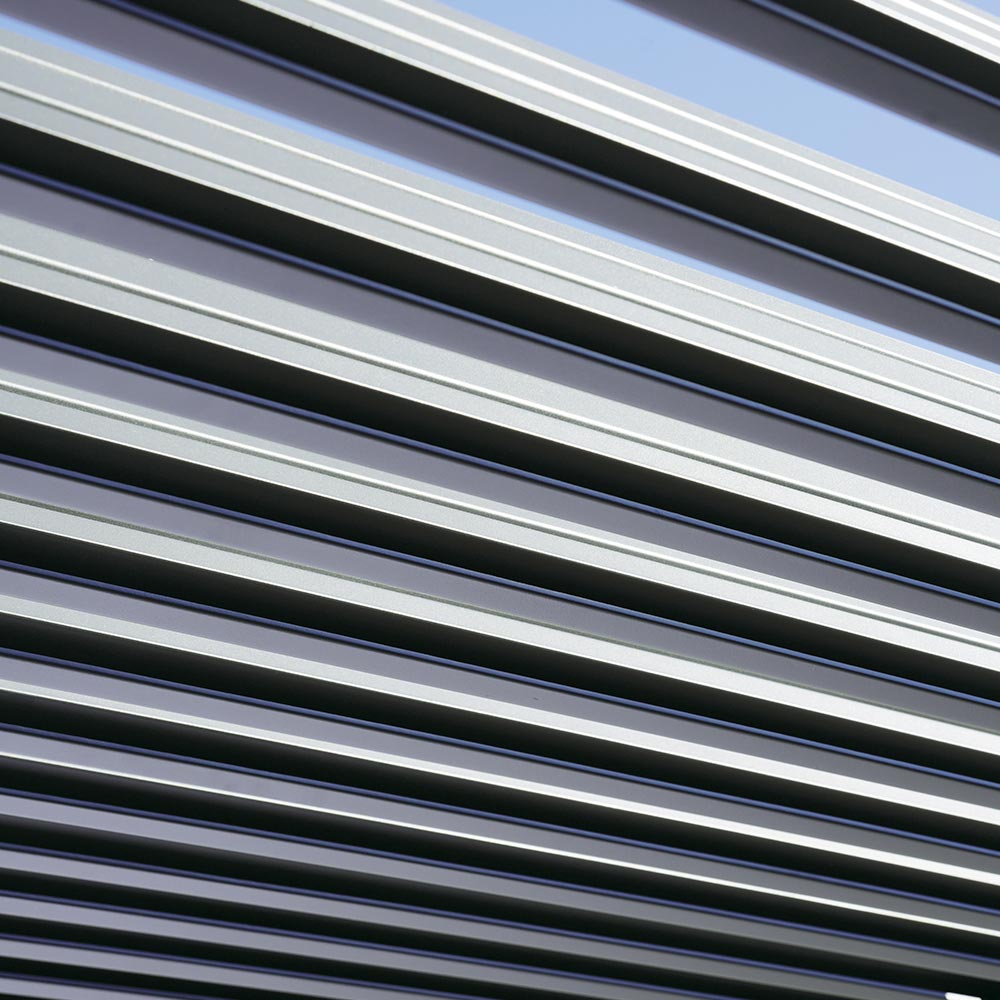Los postes de soporte de aluminio de 90 x 90 mm y los travesaños de techo de 120 x 30 mm / 147 x 30 mm proporcionan una estructura sólida y fiable. El techo de lamas ajustable , accionado mediante una manivela externa de acero , permite ajustar fácilmente la entrada de luz y la ventilación, creando el ambiente ideal a cualquier hora del día.
