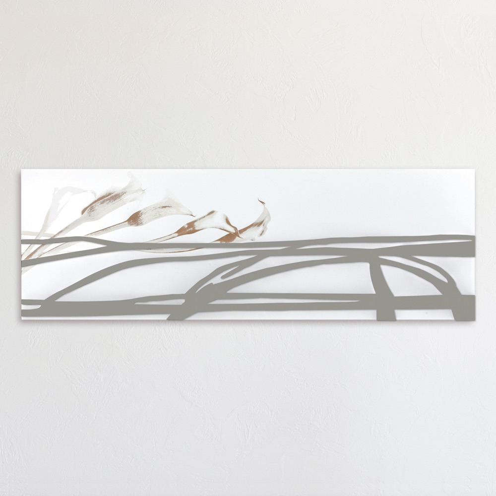 El panel decorativo está realizado mediante la técnica de marcado láser que crea un bajorrelieve en el material, creando diferentes gradaciones de color creadas en el panel. El panel está fabricado en madera lacada en blanco con aplicaciones en color arcilla . El panel es elegante y sobrio, gracias a la decoración en plexiglás espejado y al marcado de las calas.