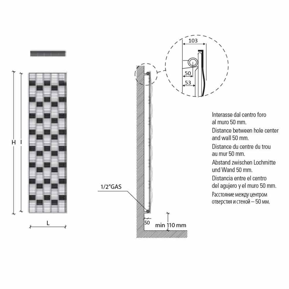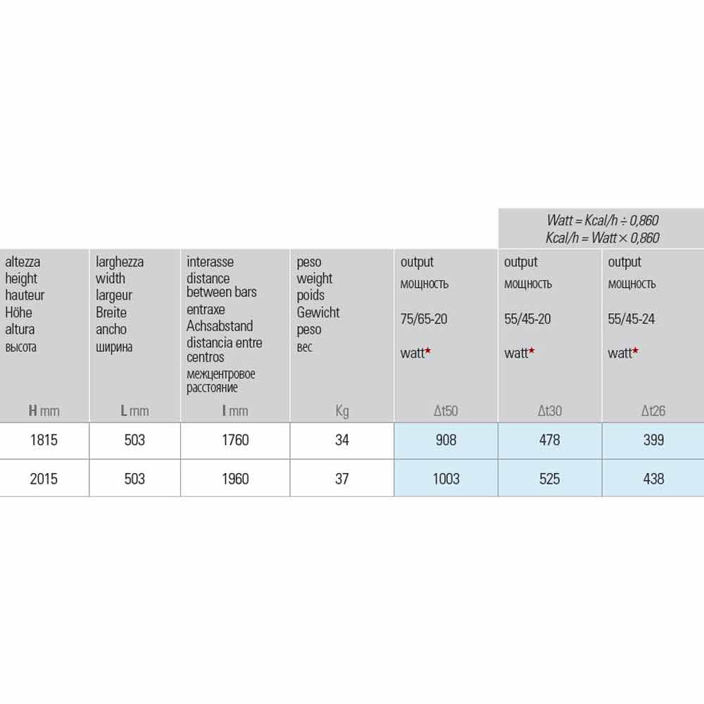 - H 2015 x L 503 x Inter. 1960 mm x rendimiento w (Δt50 *) 1003; Rendimiento w (Δt30 *) 525; Rendimiento w (Δt26 *) 438