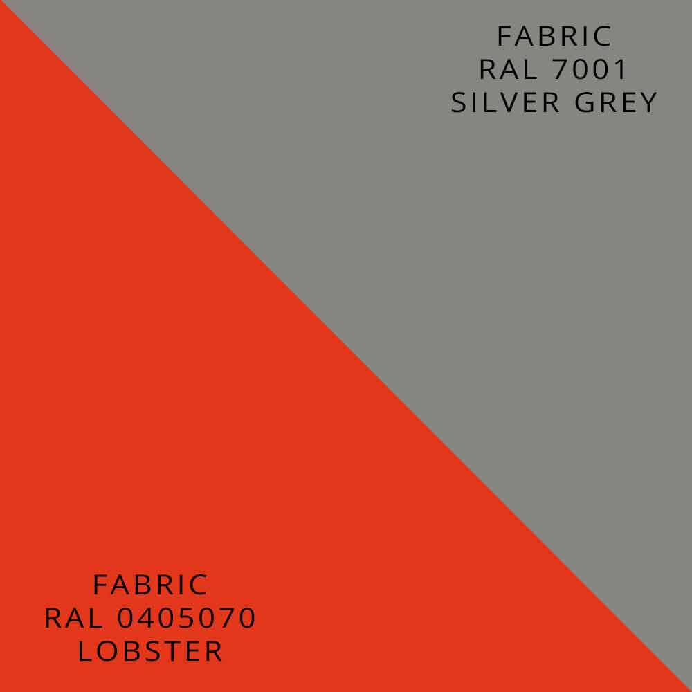 Disponible en diferentes acabados:- combinación 1: estructura negra mate rugosa y tejido bifaz RAL 0405070/7001 naranja / gris.