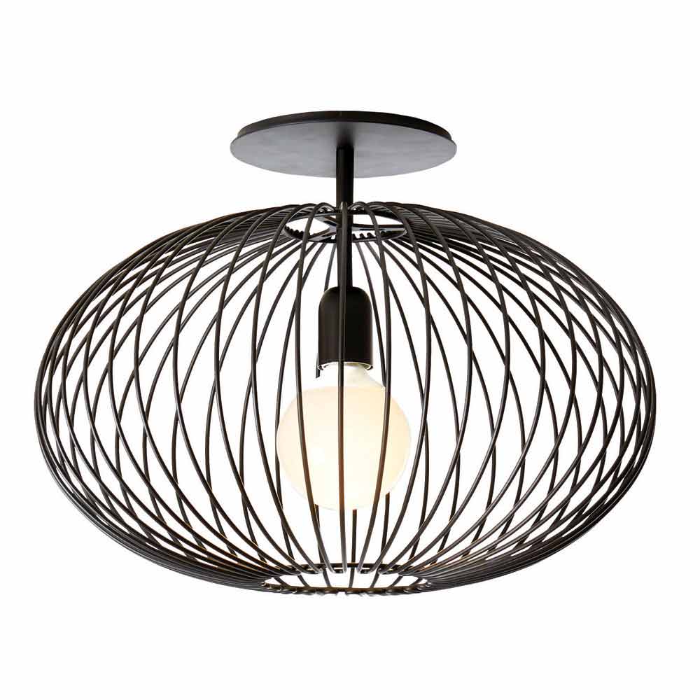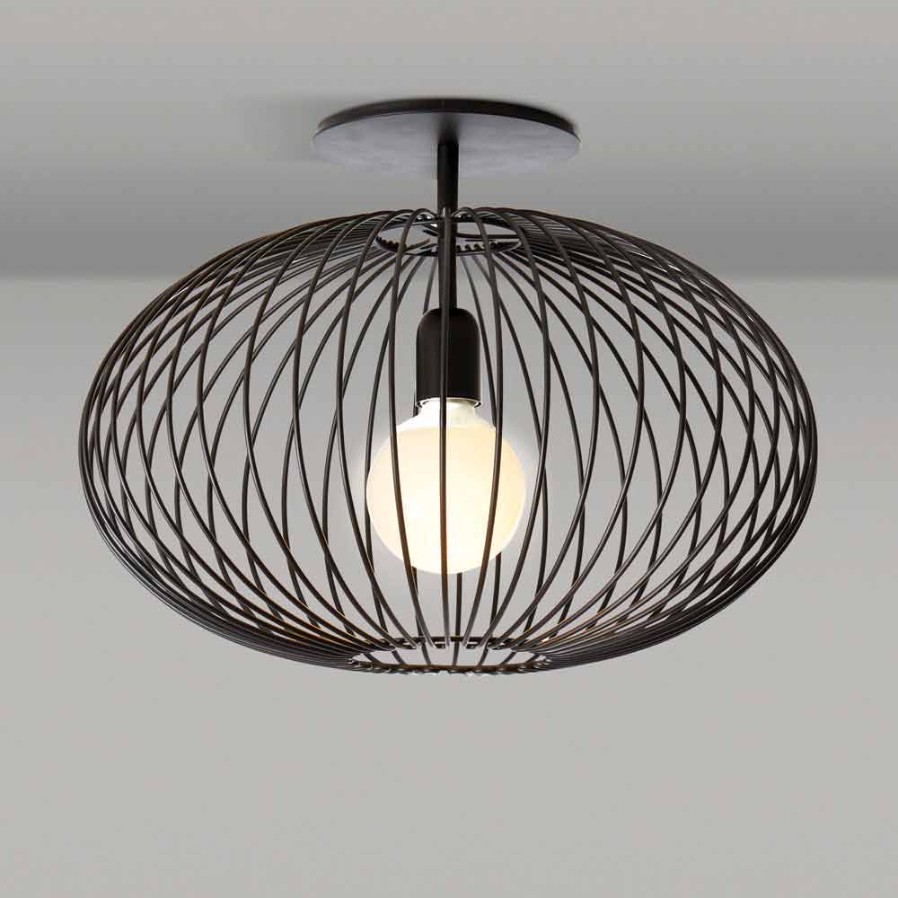 Lámpara de techo con estructura en varilla de acero pintada con polvos epoxídicos.