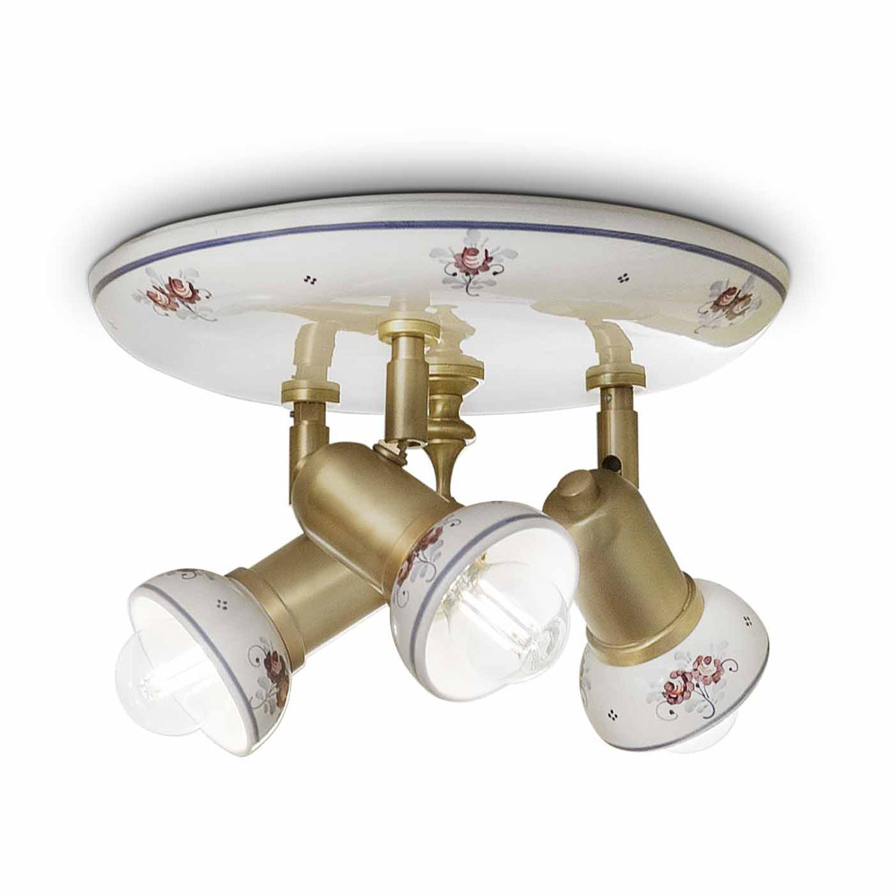 Plafón redondo de 3 luces en latón y cerámica pintada a mano, fabricado en Italia por Ferroluce.