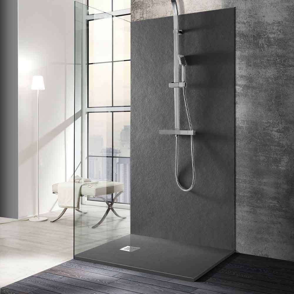 Plato de ducha moderno en resina con acabado efecto piedra con rejilla de acero.