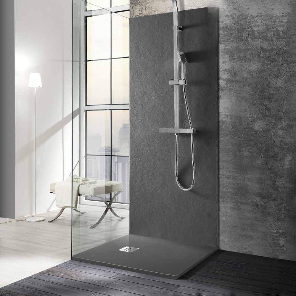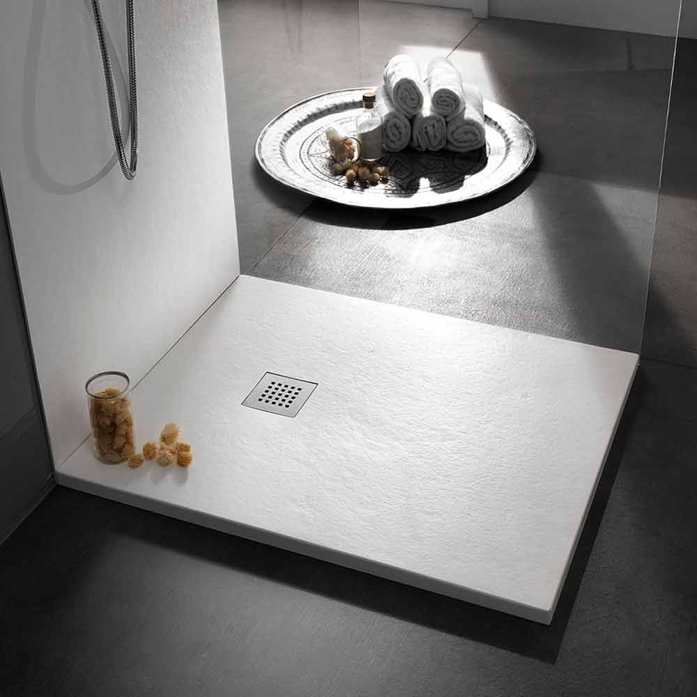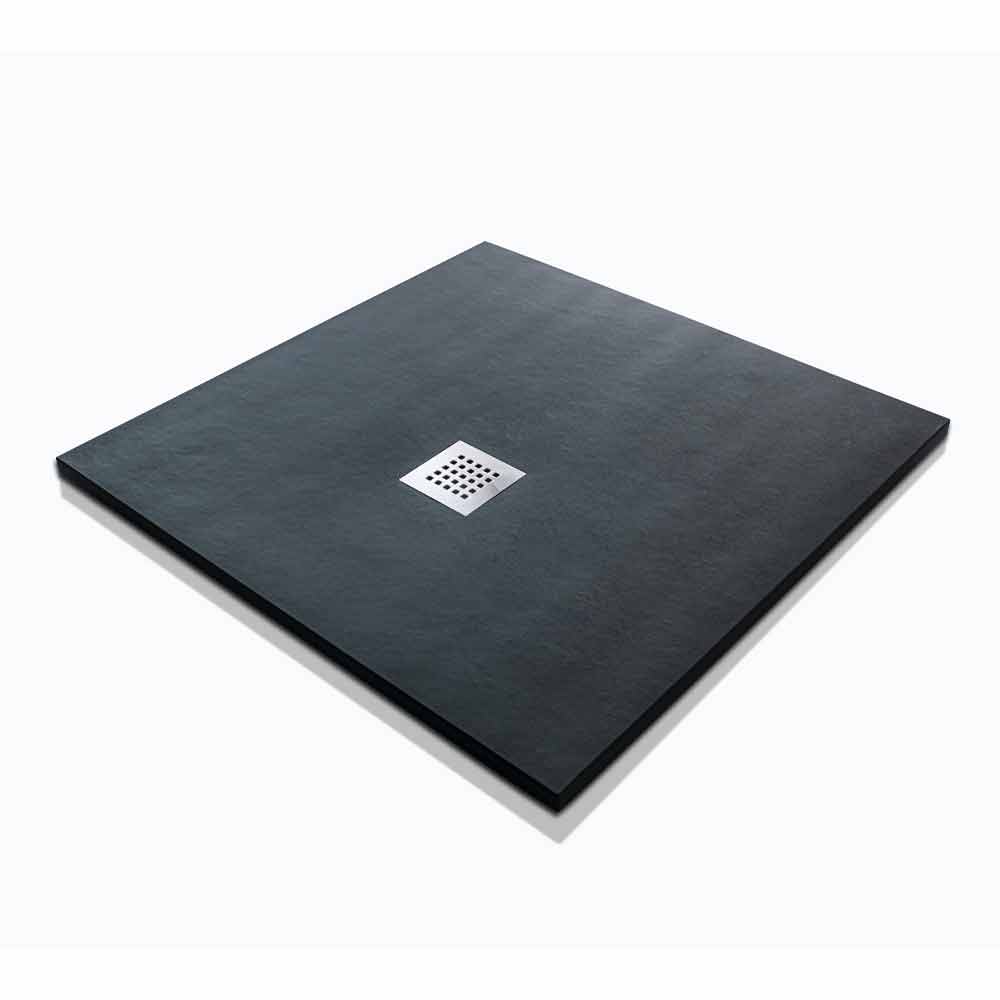 Plato de ducha moderno cuadrado 80x80 en resina efecto piedra y acero.