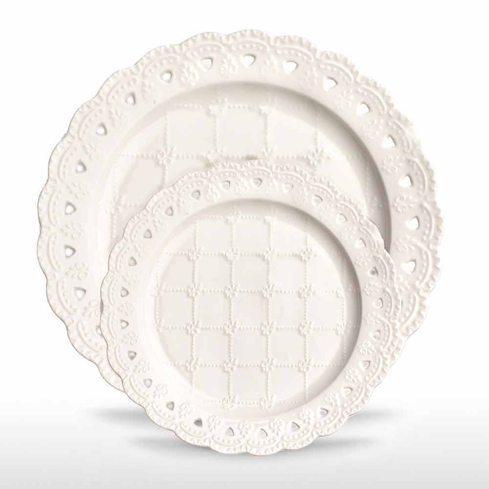 relieves florales y decoraciones perforadas a mano que realzan los platos haciendo que la mesa sea glamorosa y elegante.