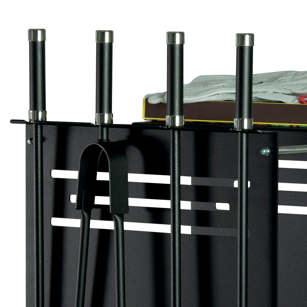 Este leñero multifuncional es un accesorio indispensable para los amantes de la chimenea. Fabricado con una robusta estructura metálica, está equipado con ruedas para facilitar su desplazamiento. No solo permite almacenar una buena cantidad de leña, sino que también ofrece espacio específico para las herramientas necesarias para el cuidado del fuego: pala, cepillo, pinza y gancho, manteniendo así el orden y la practicidad.