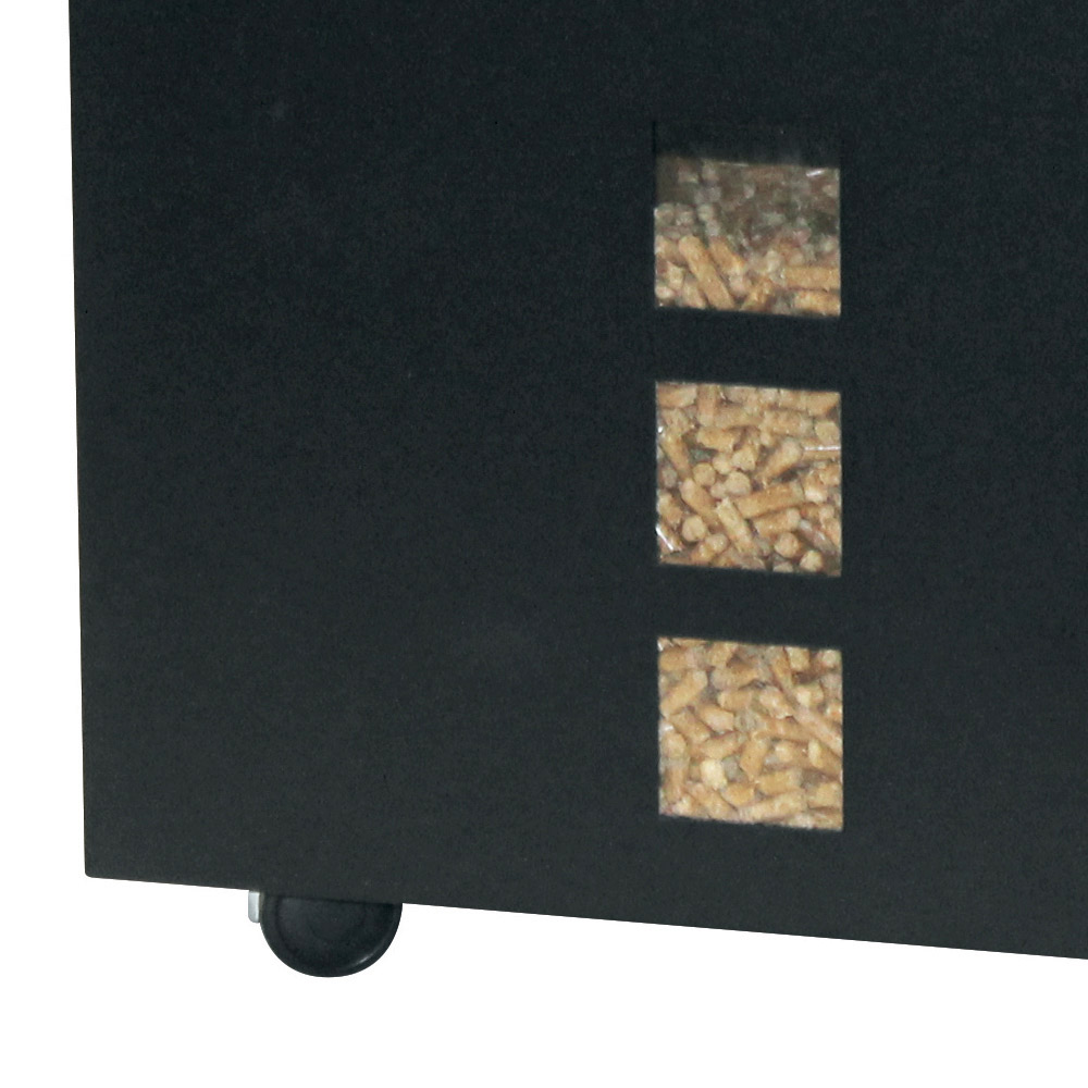 Con espacios claros que le permiten monitorear el nivel de pellets y agregar un elemento visual interesante a la estructura, este contenedor también cuenta con una tapa superior para facilitar el llenado. Las ruedas en la parte inferior garantizan la movilidad del contenedor, permitiendo mover el pellet fácilmente de una habitación a otra.