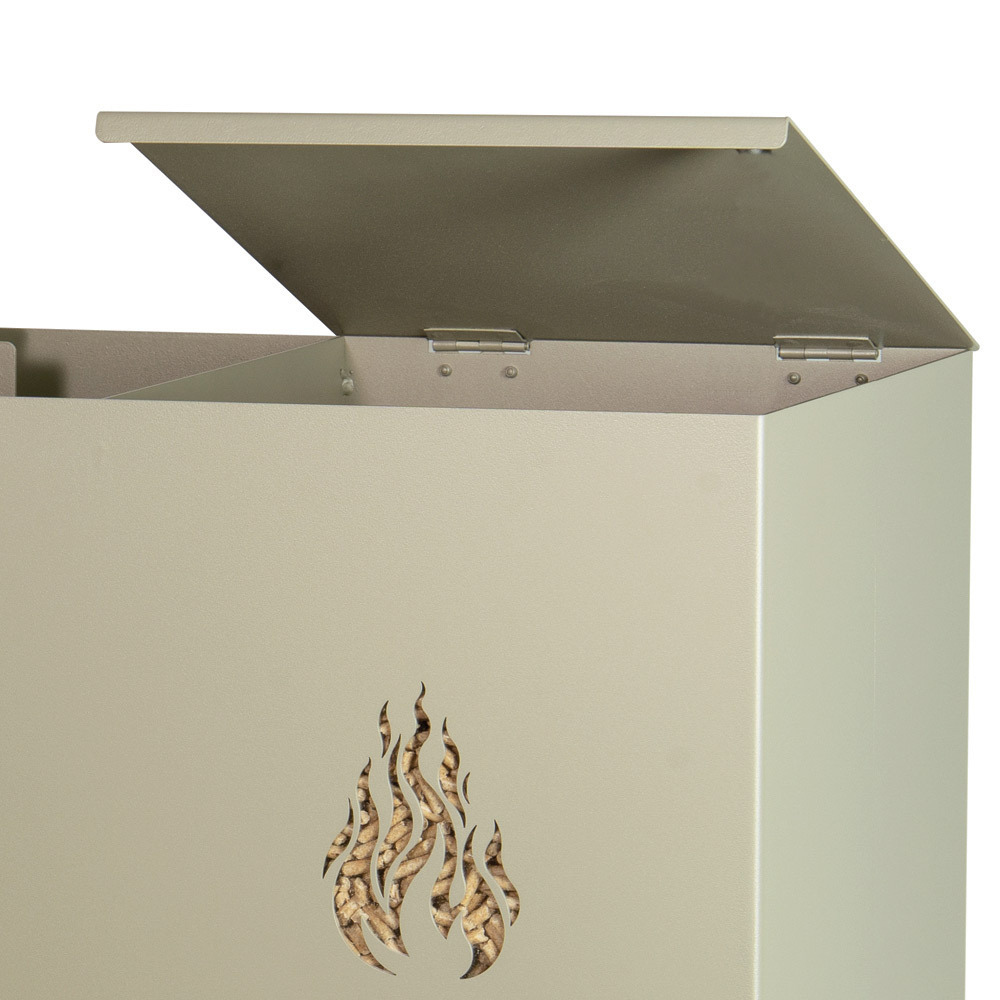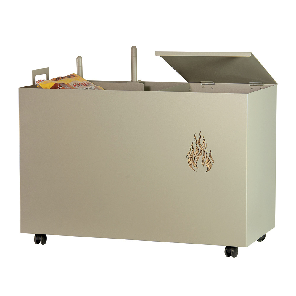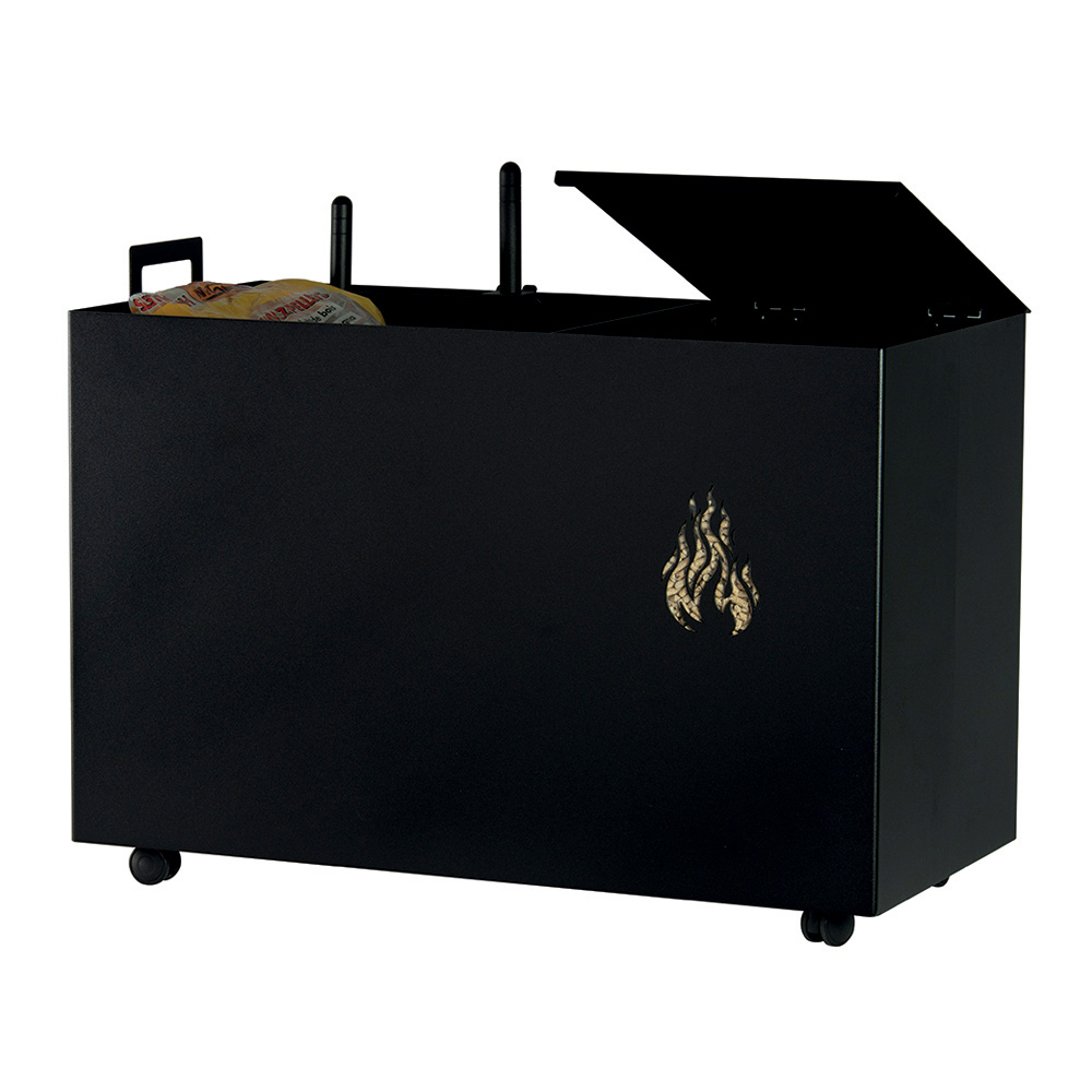 Este carro de pellets para chimenea es una solución ideal para quienes buscan una forma elegante y práctica de almacenar pellets. La estructura robusta y el diseño moderno encajan perfectamente en cualquier estilo interior. El símbolo de la llama en la parte delantera añade un detalle decorativo que subraya la función del carro y lo hace inmediatamente reconocible.