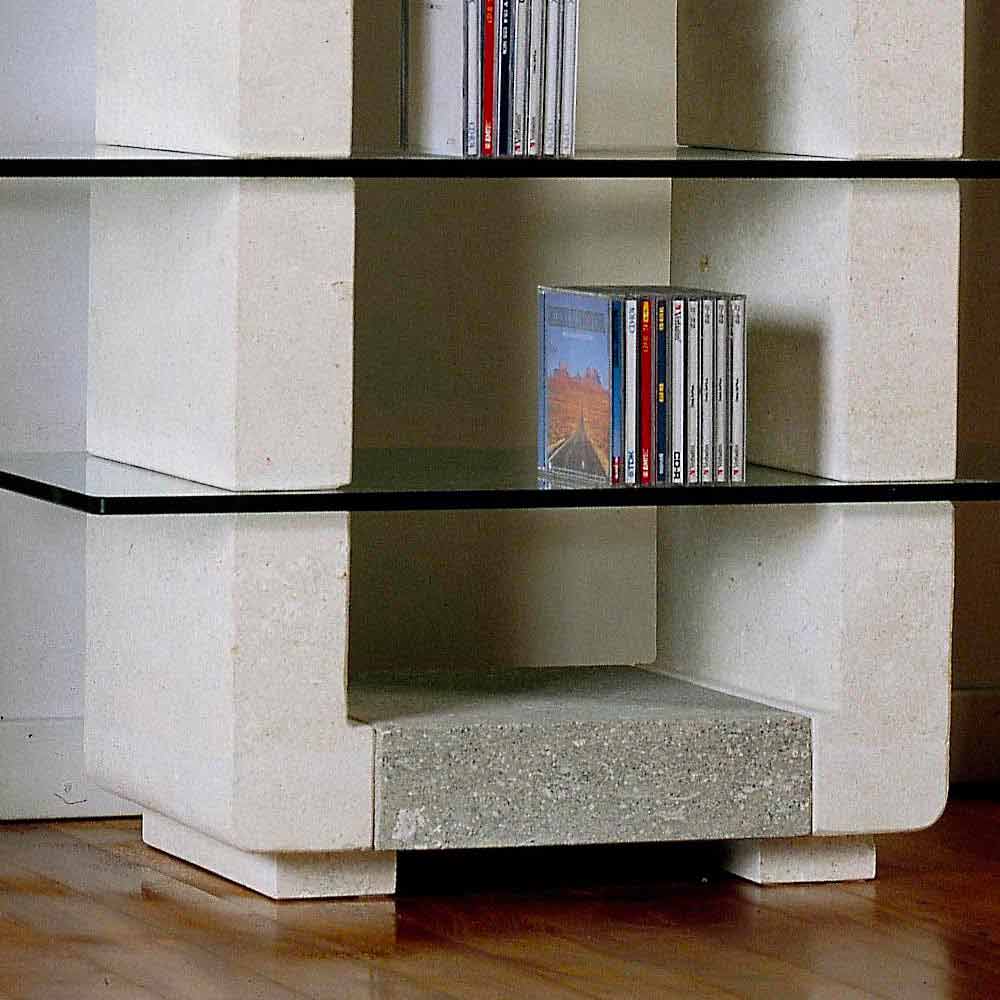 Porta hi-fi componible, realizado enteramente en Italia, realizado con la combinación de la piedra natural blanca y gris de Vicenza, y tableros de cristal de 12 mm de grosor. La esencialidad de la forma y la combinación de los materiales lo convierten en un objeto moderno y funcional adapto a una decoración minimalista. Las piedras son tratadas con un impregnante a base de agua, lavable y ecológico.