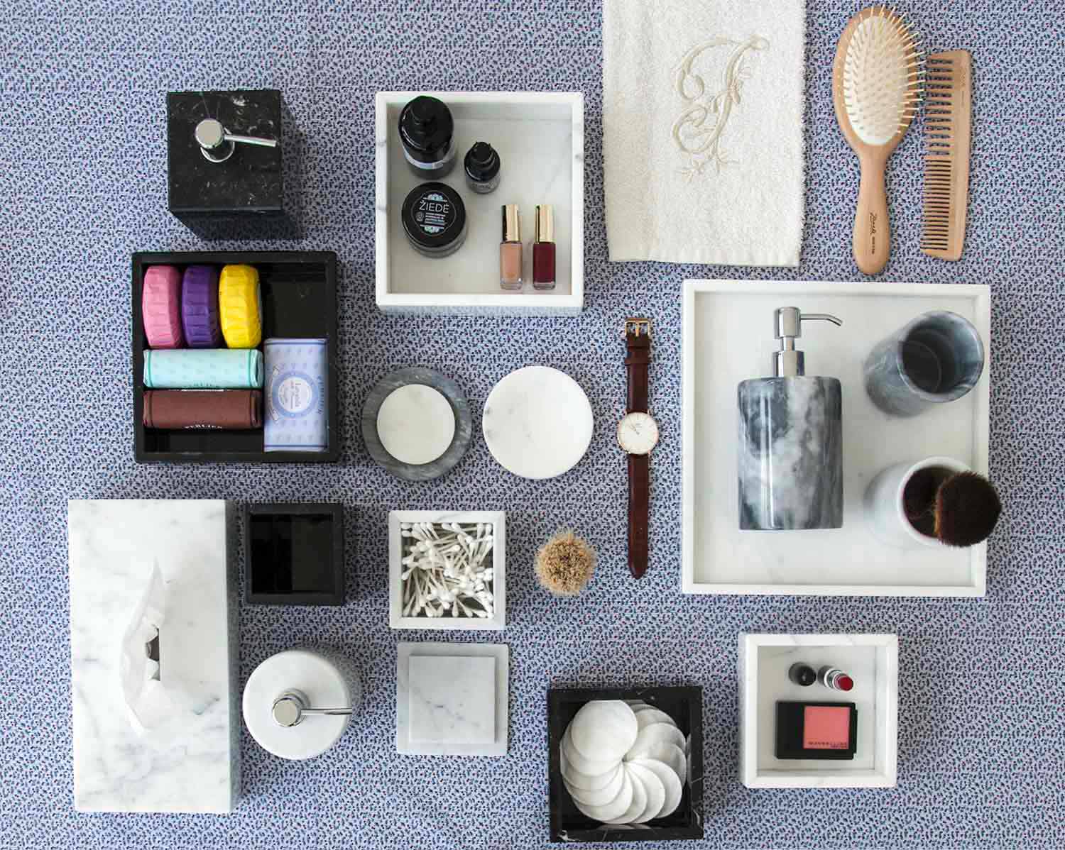 Portacepillos de vidrio fabricado íntegramente en mármol Paonazzo, una variedad de mármol precioso típico de la tradición italiana caracterizada por un fondo blanco mantequilla con vetas del azul intenso al naranja.