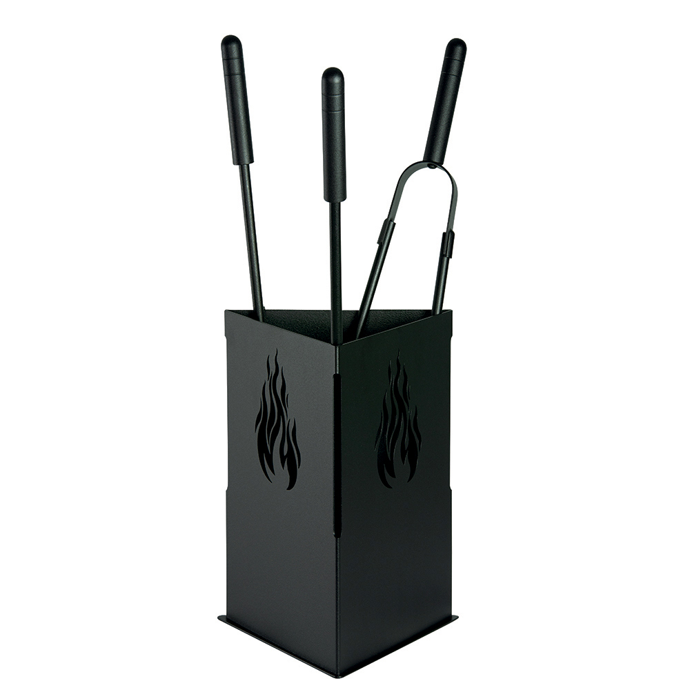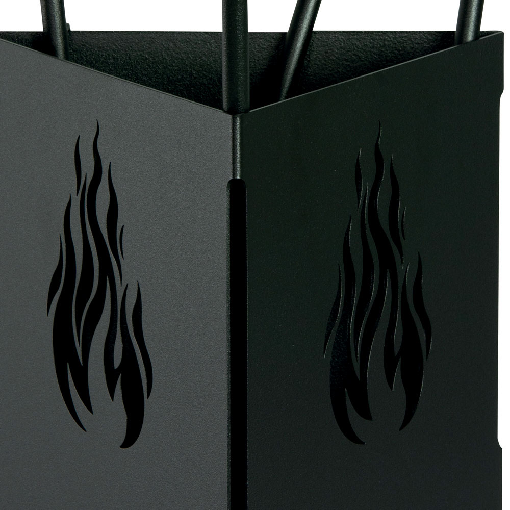 Este elegante portaherramientas para chimenea combina practicidad y diseño moderno, combinando la robustez del metal con el fino acabado en negro o antracita. Su aspecto triangular está adornado con cortes de llama en los laterales, que enriquecen la estética. Este portaherramientas es imprescindible para mantener el área de su chimenea ordenada y funcional. Su estructura compacta la hace ideal para cualquier espacio, asegurando que todo lo que necesitas para el cuidado de tu chimenea esté siempre organizado y al alcance.