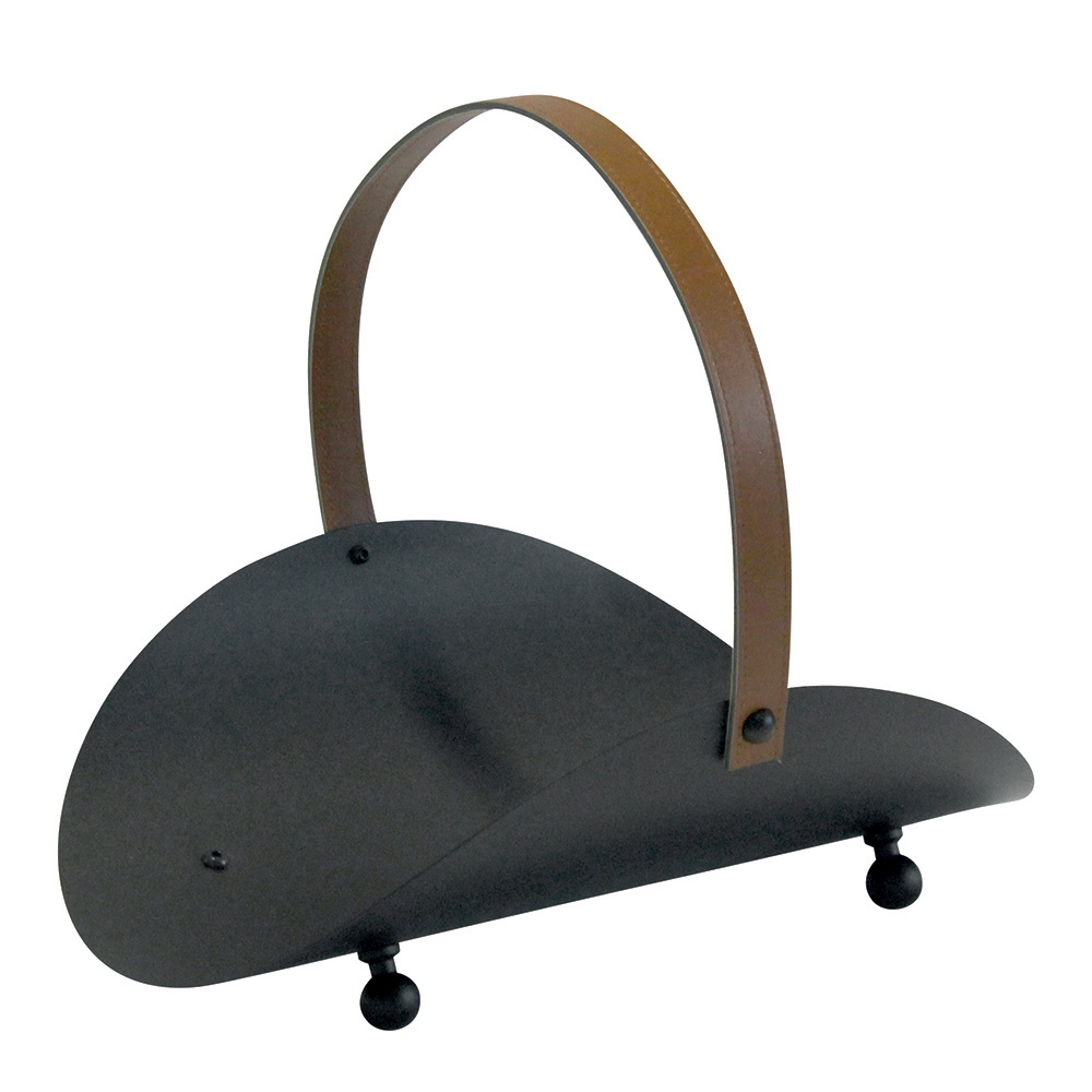 Este leñero es un objeto de diseño funcional que encarna la elegancia en su máxima expresión. Fabricado con un robusto cuerpo de metal y acabado en un clásico tono negro, se complementa con un asa de cuero que le añade un toque de sofisticación rústica.