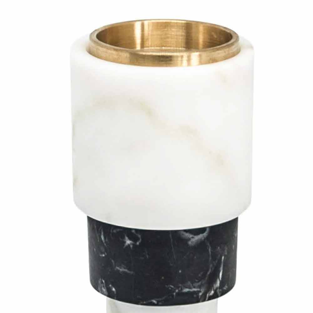 Portavelas bicolor fabricado con mármol y latón de alta calidad . Debe considerarse una pieza única ya que cada bloque de mármol utilizado se diferencia de los demás en vetas y matices. El mármol blanco procede de la cantera de Poggio Silvestre, fuente de mármol de primera calidad clasificado desde el siglo pasado, mientras que el mármol negro Marquinia se extrae de las canteras españolas.