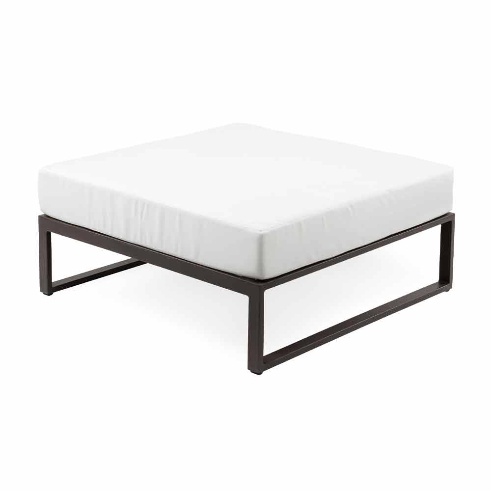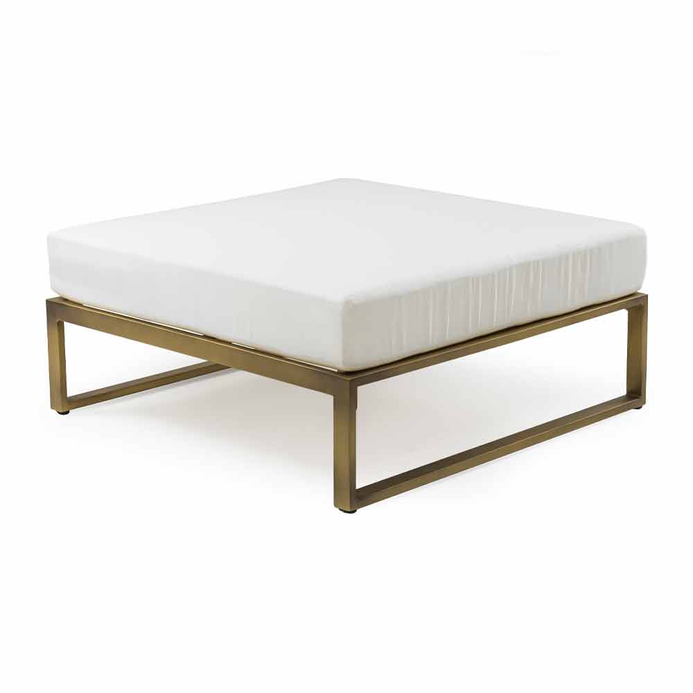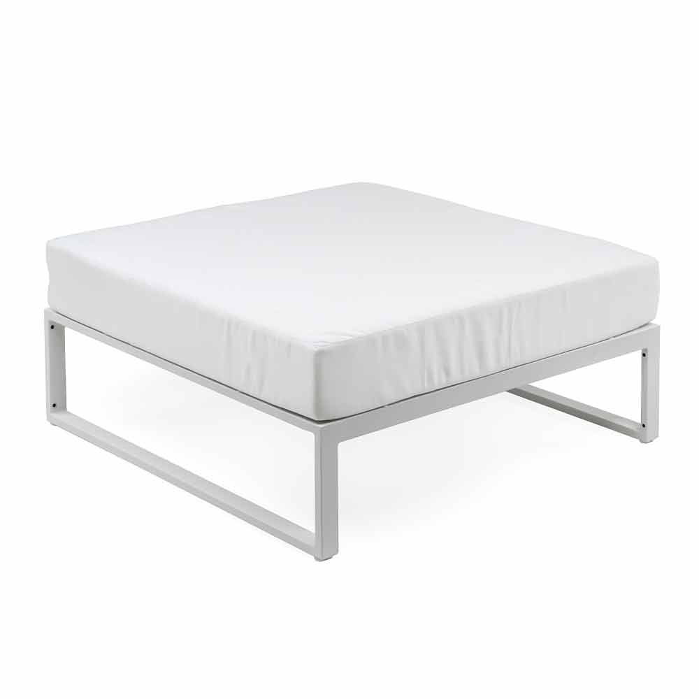 Puf cuadrado para salón exterior con estructura de aluminio en 3 acabados y cojín de tela blanca, diseño de lujo.