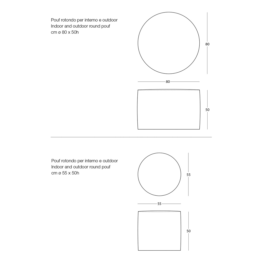 Puf otomano redondo para interior o exterior en fibra de poliéster azul, gris tórtola o cáñamo, artículo de calidad made in Italy.