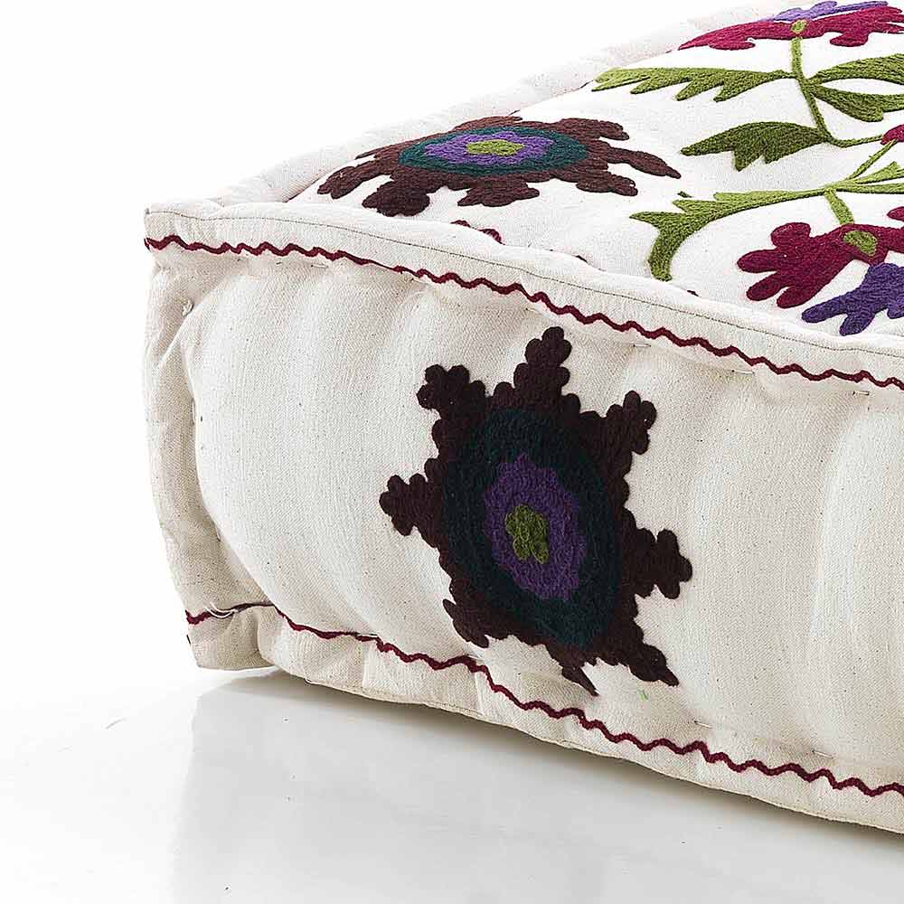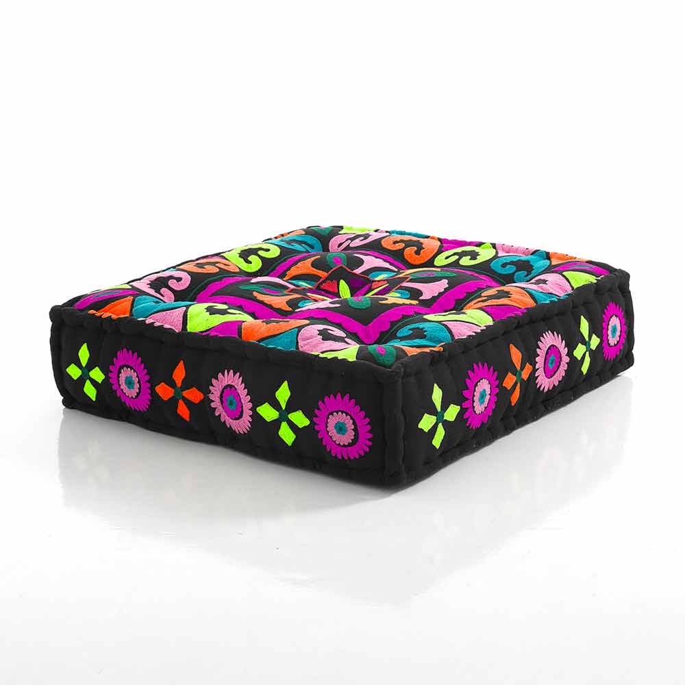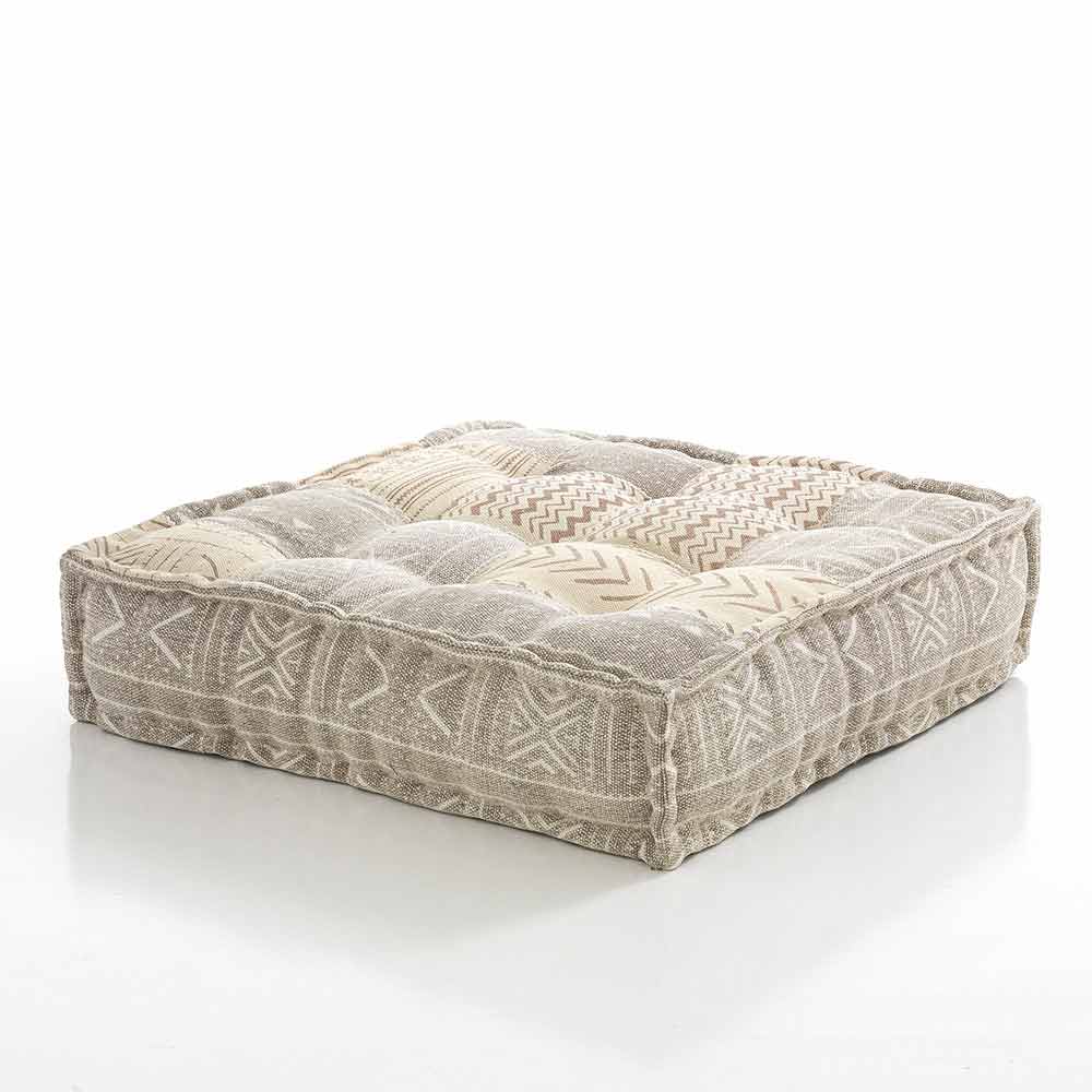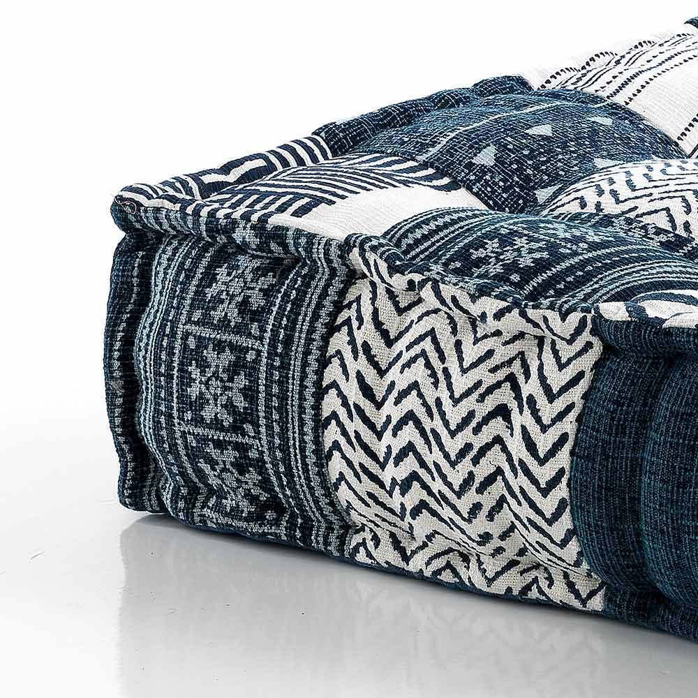 Puf en tela patchwork o terciopelo cuadrado con diseño étnico.