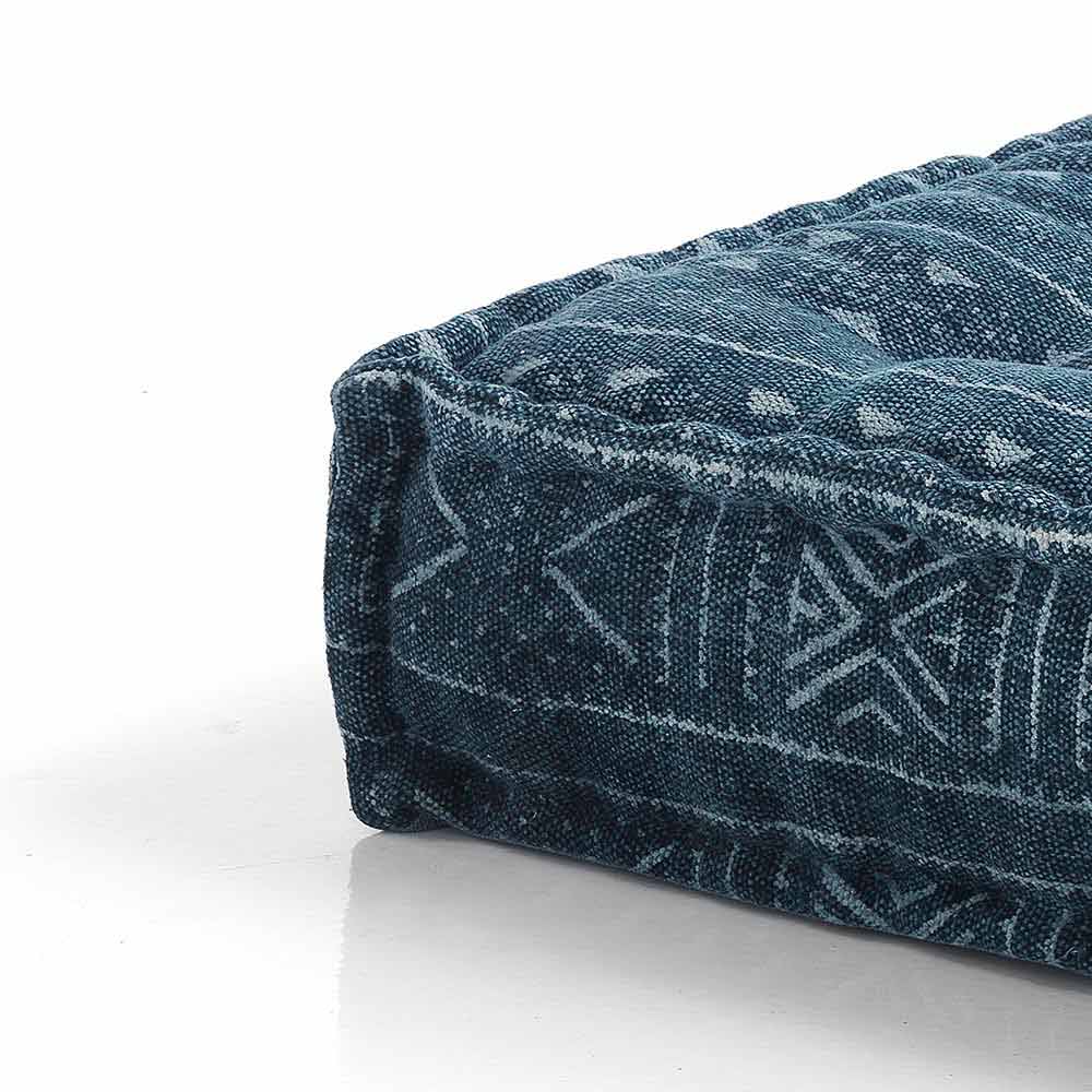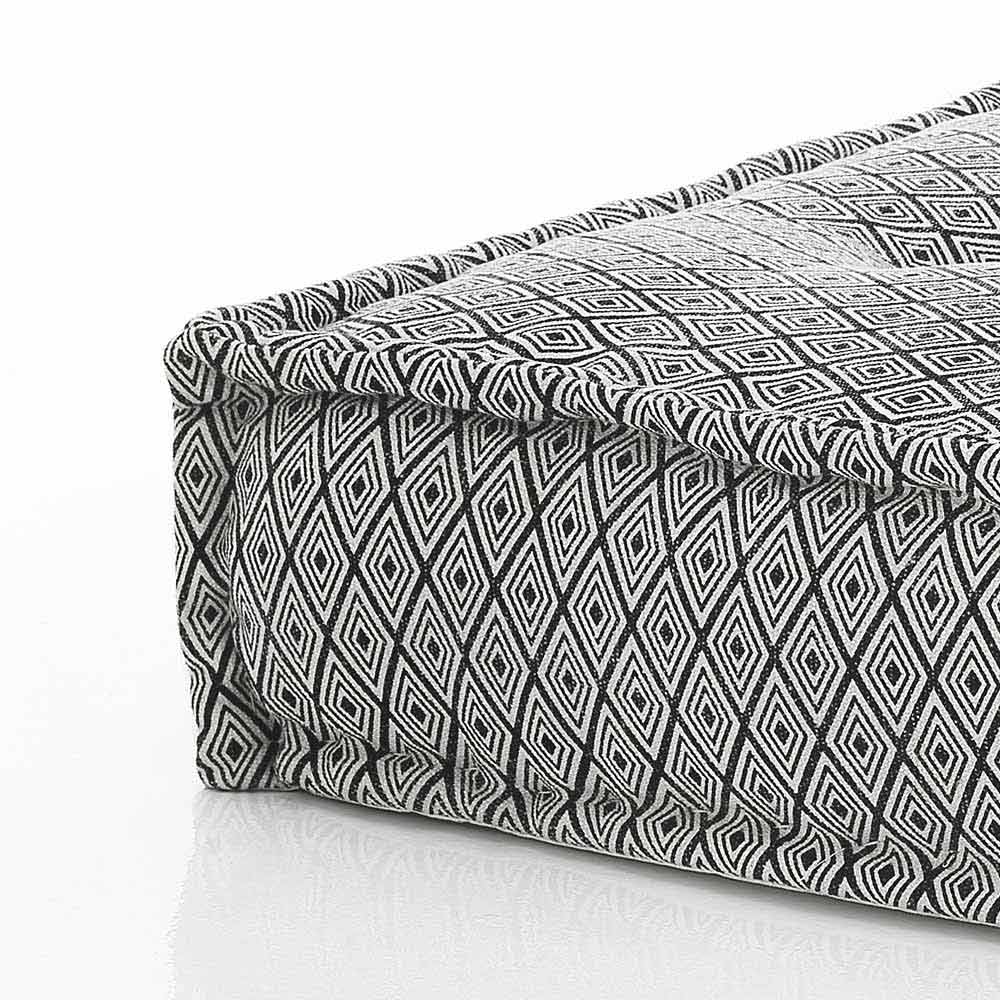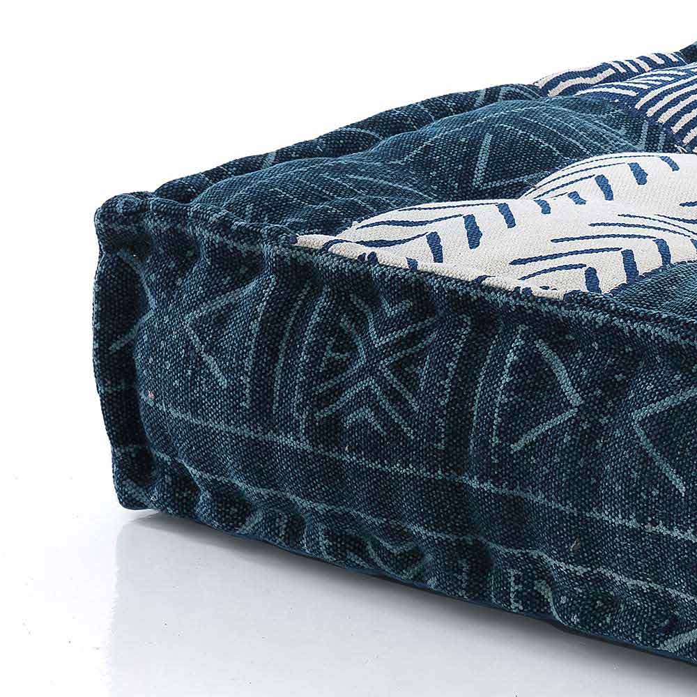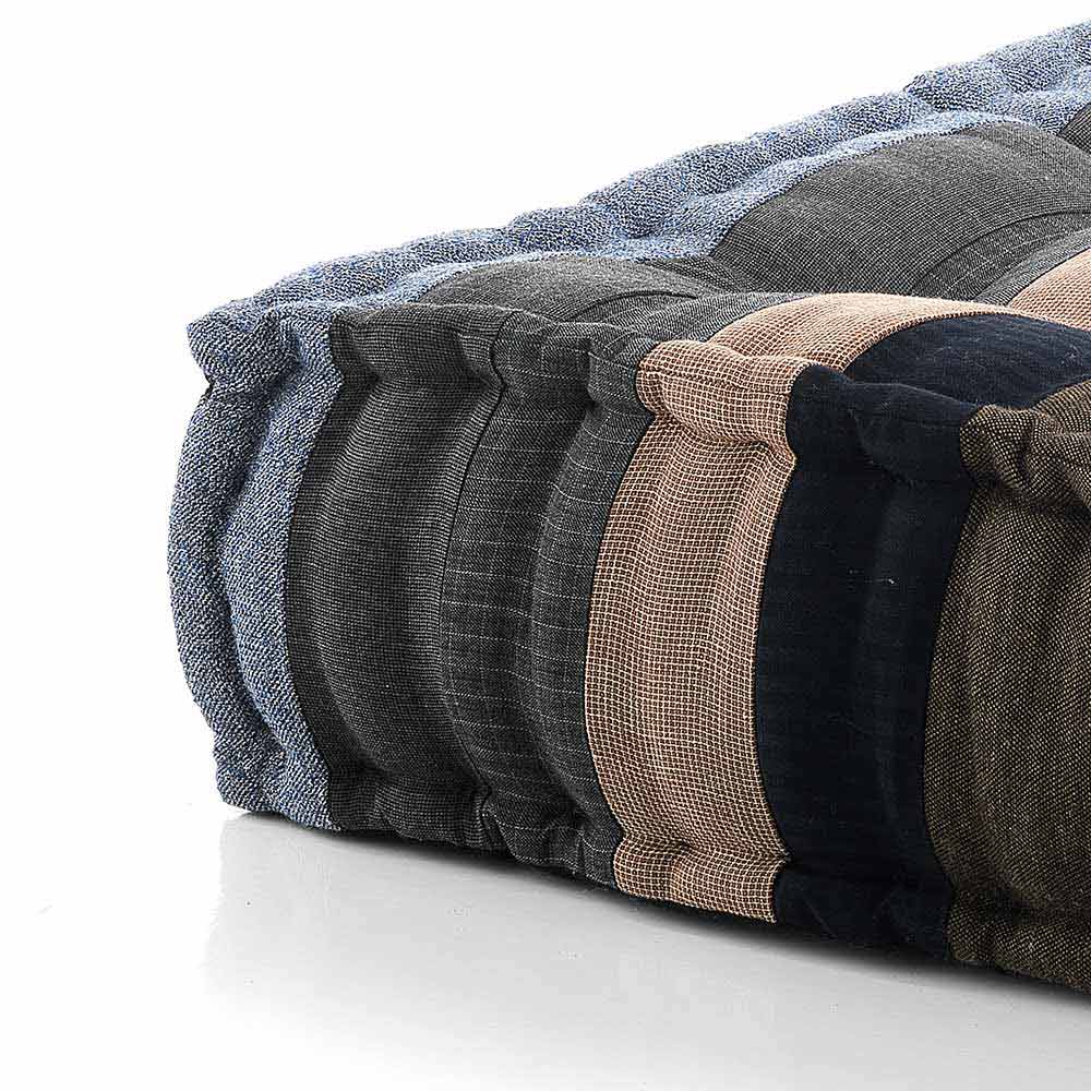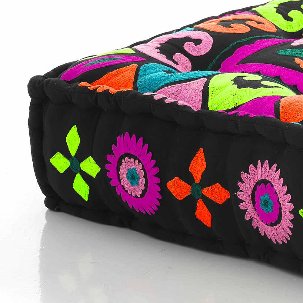 Puf en tela patchwork o terciopelo cuadrado con diseño étnico.