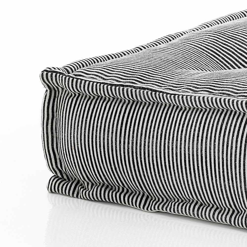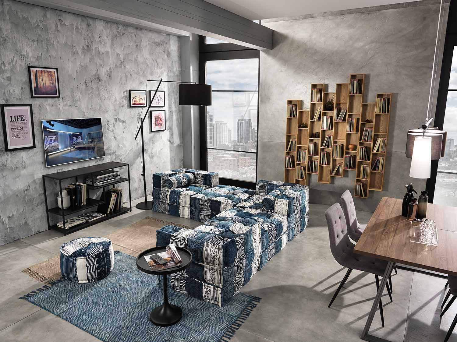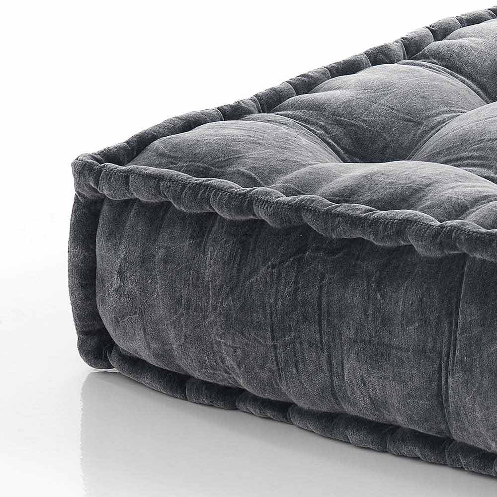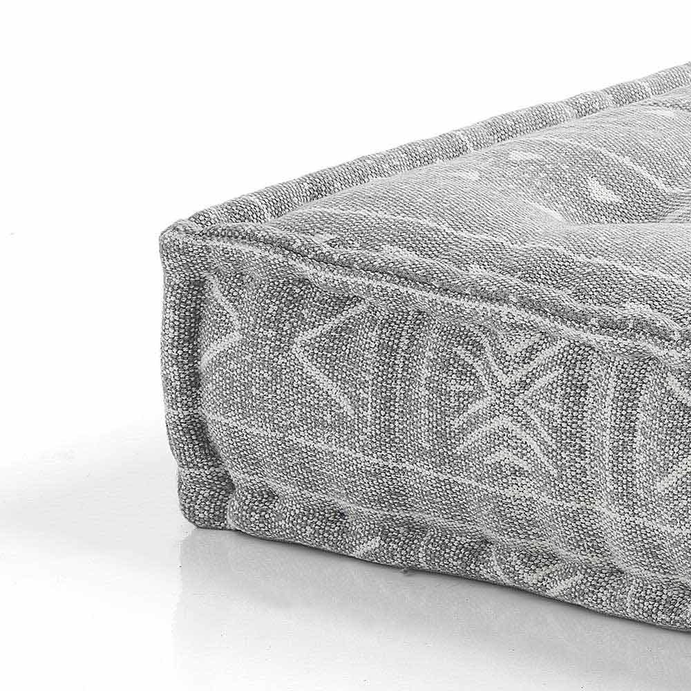Puf en tela patchwork o terciopelo cuadrado con diseño étnico.