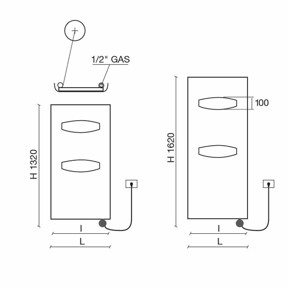 A la altura hay que añadir el termostato de 110 mm. Caja termostática blanca de serie para radiadores blancos; cromado para los radiadores de colores y acabados en acero inoxidable. Fuente de alimentación monofásica de 230 voltios.