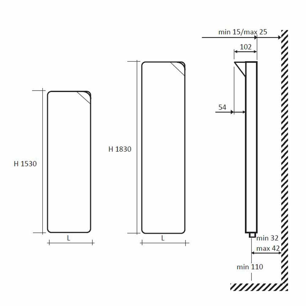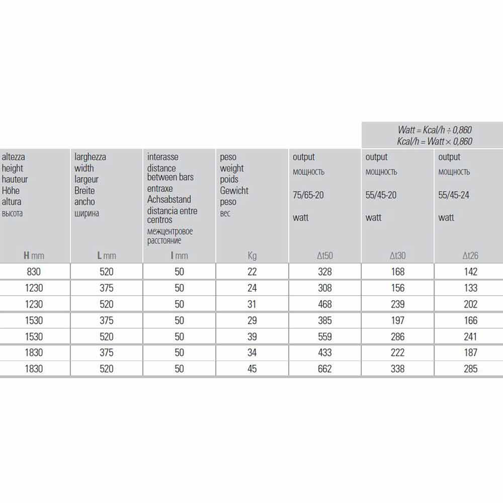 - H 1830 x L 520 x Inter. 50 x P 48 mm x Salida w (Δt50 °) 662; Rendimiento w (Δt30 °) 338; Rendimiento w (Δt26 °) 285