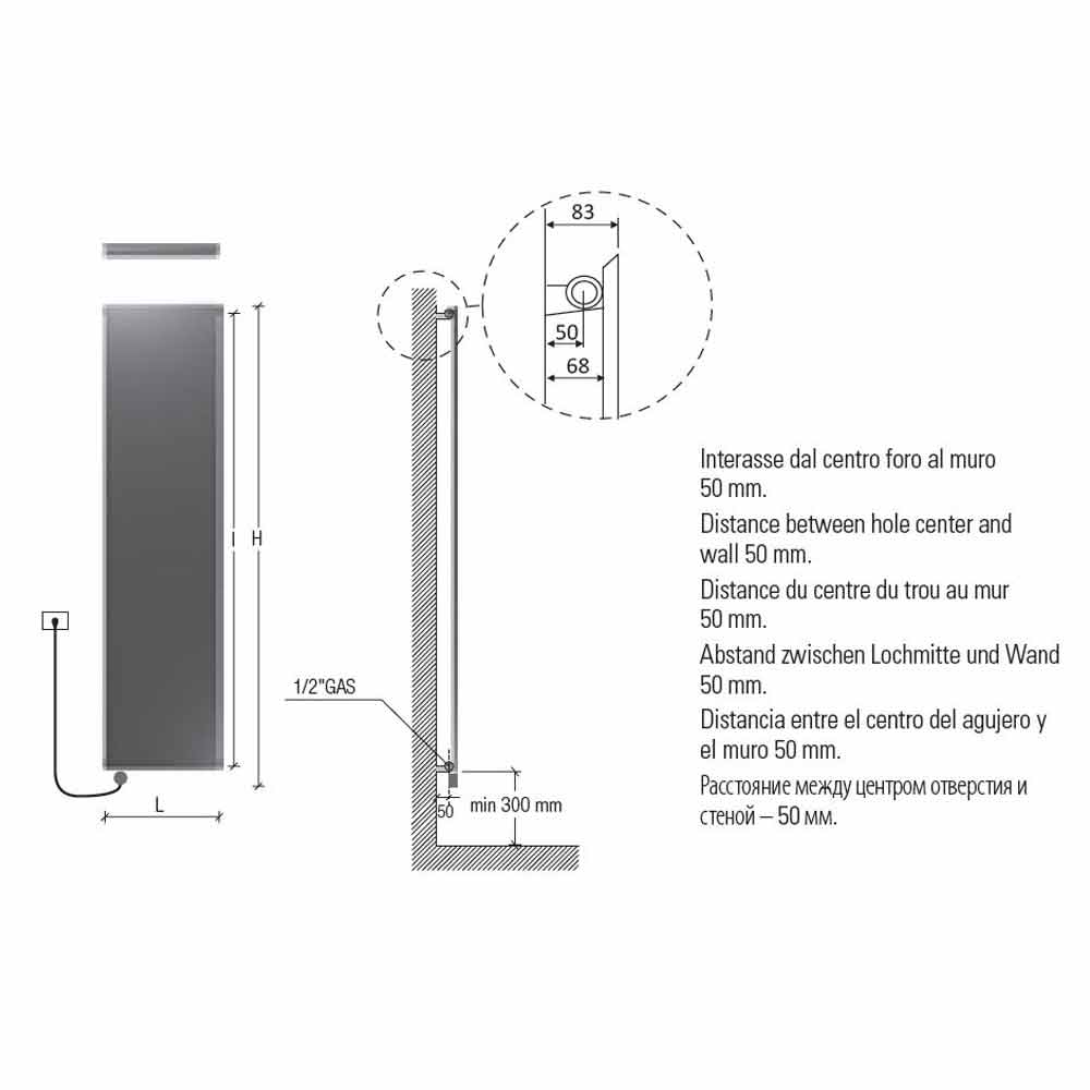 Tenga en cuenta que el termostato de 110 mm debe agregarse a la altura. Caja termostática blanca de serie para radiadores blancos; cromado para los radiadores de colores y acabados en acero inoxidable. Fuente de alimentación monofásica de 230 voltios.