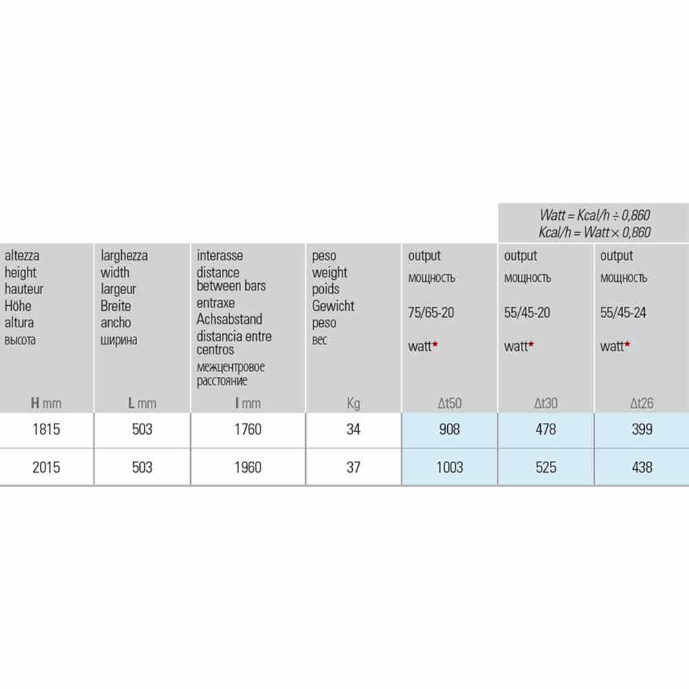 - H 1815 x L 503 x Inter. 1760 mm x Salida w (Δt50 *) 908; Rendimiento w (Δt30 *) 478; Rendimiento w (Δt26 *) 399